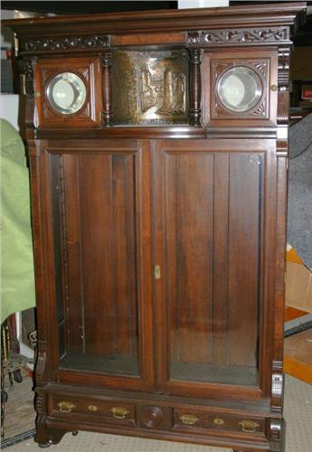 Victorian style bookcase has glass doors and three adjustable wooden shelves. There are two drawers at bottom. There are two mirrored doors on either side at top. Measures approximately 44" x 76" high. Walnut wood.