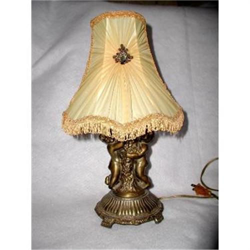 Unique Victorian boudoir lamp C.1920 has ornate gathered shade in yellow very fine net over fabric gathered with antique Gold tiny braid emblem front and back. Antique gold tassel trim surrounds the scalloped shade with tinm sides and top. Two ornate antique gold cherubs with center pedestal and base. Rewired with thumb roll off and on,works perfectly. Excellent condition.Measures 15H X 9L X 7W.