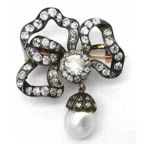 The bow consists of a round diamond approximately 0.80ct., G-H color, VS/SI clarity, framed by 12 prong-set round diamonds totaling approximately 0.40ct. 44 bead-set round old European-cut diamonds are in the ribbon totaling approximately 2.50ct. It is suspended by a pearl drop, consisting of a cup set with 8 bead-set single cut diamonds and a beautiful silver white pearl with no visible blemishes and very high luster, measuring 13mm long and 9mm wide. There is an inscription on the top ?1862-8 Oct. 1892? The silver and gold mounting has a beautiful patina. It is 2.5" wide and 2.75" long.