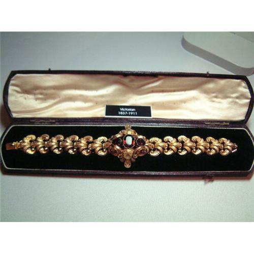 10 kt. yellow gold die rolled Victorian flexible link bracelet, centrally set with one approx. 4 carat cushion cut garnet, flanked by 2 oval cushion cut garnets of approx. l.5 carat each, 6-3/4" long, 14.3 dwt. Excellent orig. condition with nice tubular gold link supports, and centering a glazed circular receptacle for a lock of hair or photo on the back side of the bracelet. Each link nicely textured in overlapping palmette design. Original box relined. Color of garnets is rich, deep red, with nice translucency, and overall color saturation.