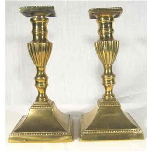 A beautiful pair of English Victorian Cast Brass candlesticks with seperate integral bobeche'. A rich soft patina and beaded and fluted decoration. 6.1/2" tall. There is a very slight lean to one candlestick.
