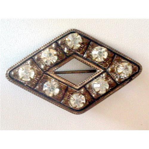 A very lovely diamond shaped brass and claw set clear paste brooch with the old "C" close on the back. Open diamond cut out in the centre, eight lovely and still sparkly stones with lovely etched detailing in between. All stones are foil backed and open set at the back. Measures 1-1/2" inches wide from east to west and 1" inch in height. Excellent vintage condition has developed a very nice aged patina.