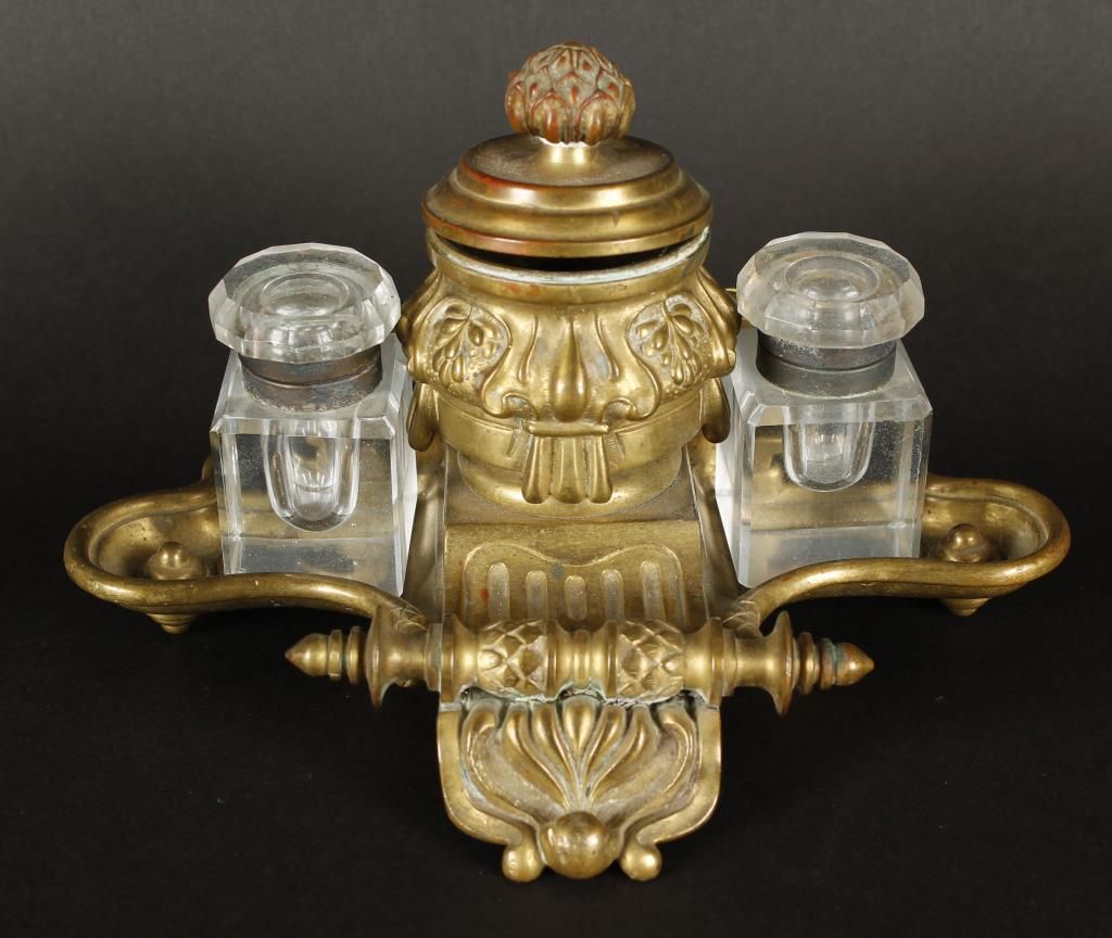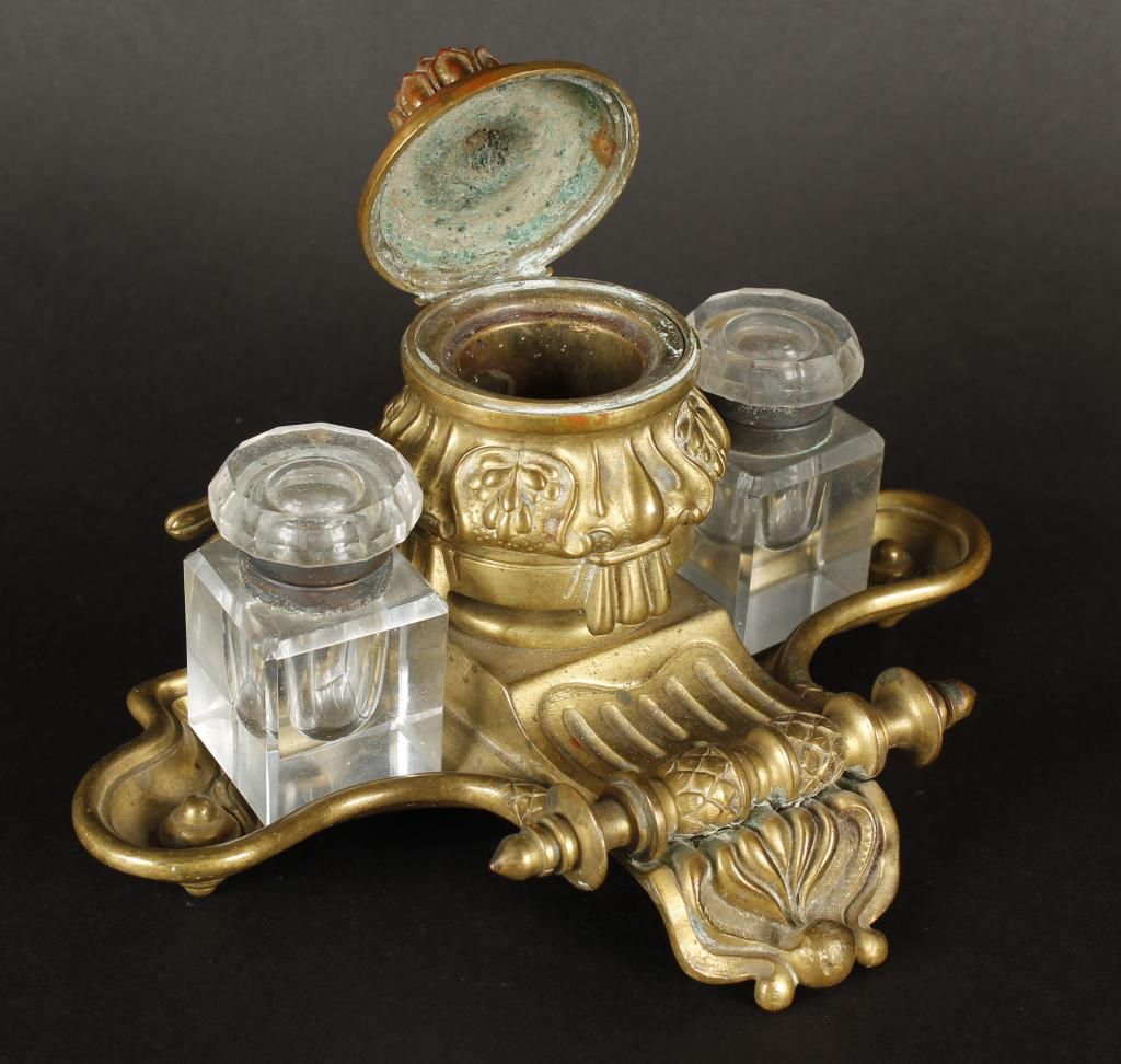 With scroll type design and artichoke finial. (2) heavy clear glass wells. Unmarked. In overall very good plus condition. Circa 1890-1910.