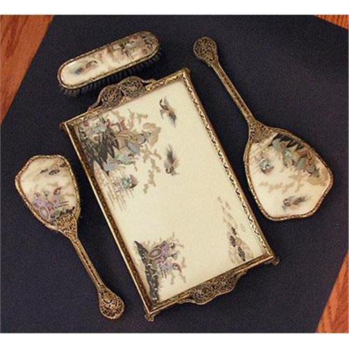 <tr><td>Title:Victorian Brass & Silk Orietal Motif Vanity Set</td></tr>