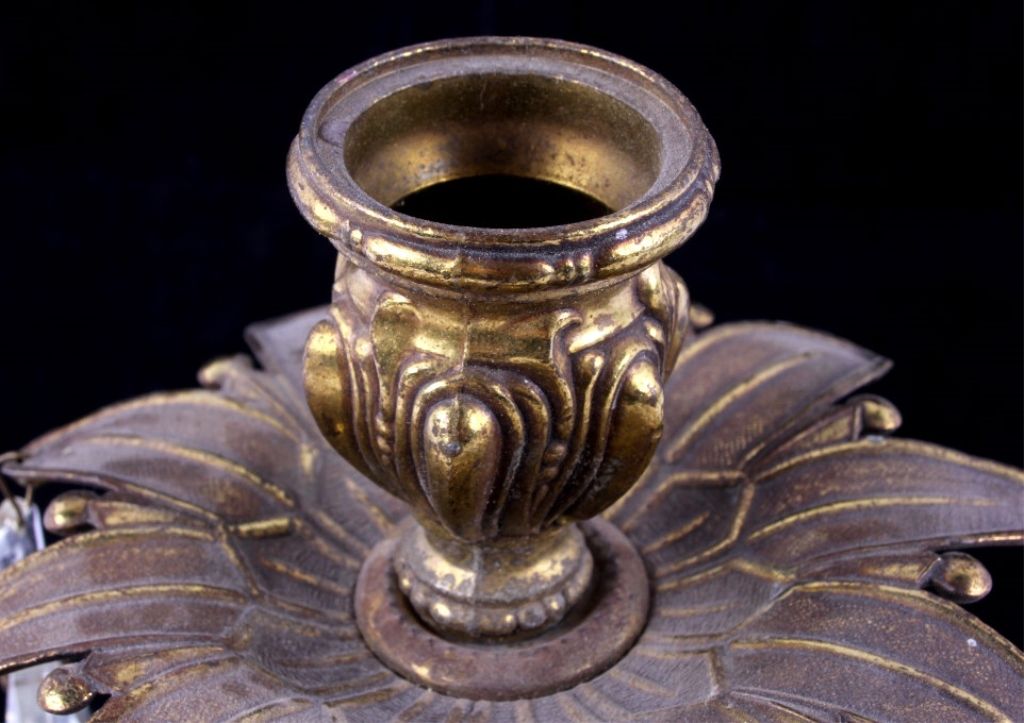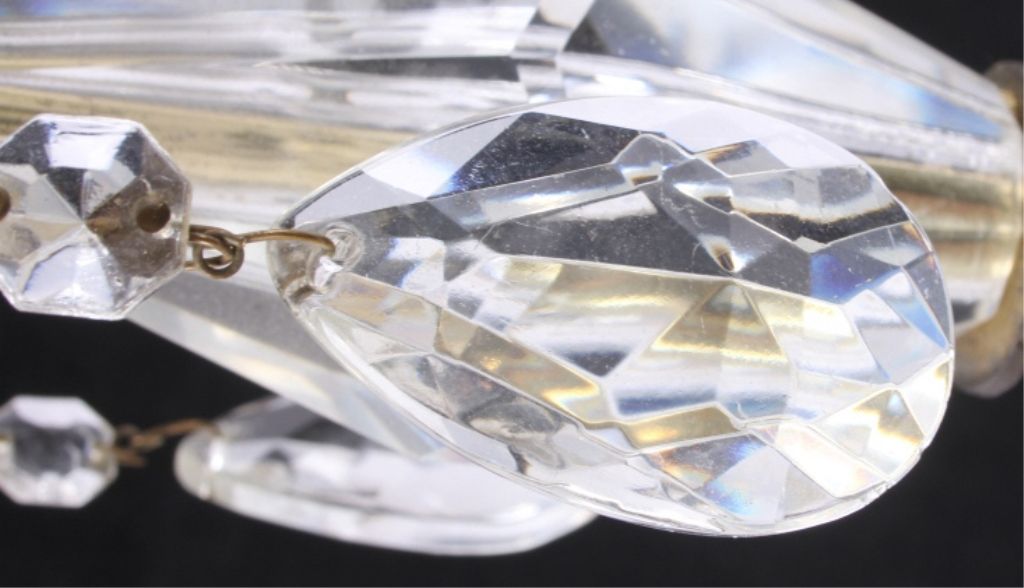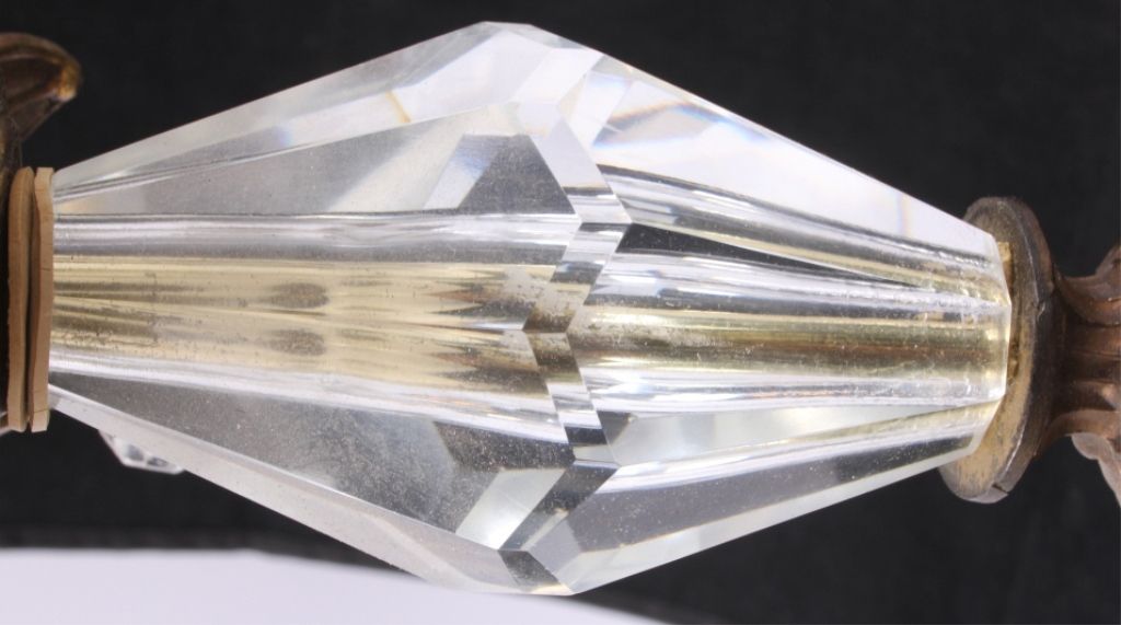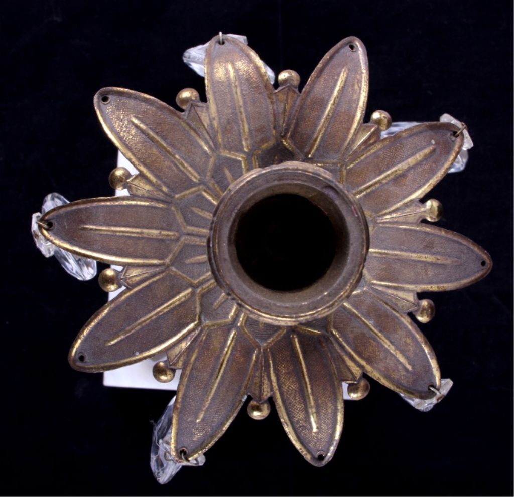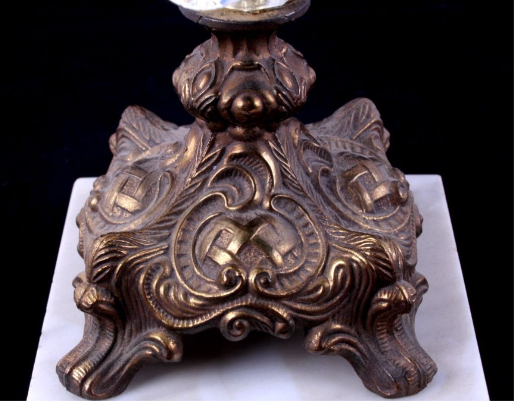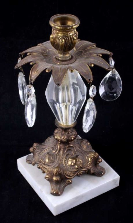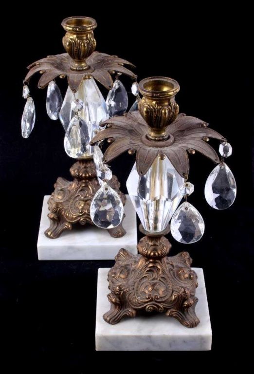 The lot features an early 1900's Victorian Candle Holders shows a cast brass top and bottom with marble base and cut crystal. Each measures 10.5" tall with a diameter of 5.25" and a 4.5"x4.5" base.