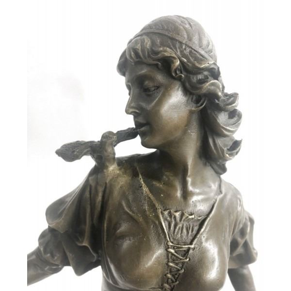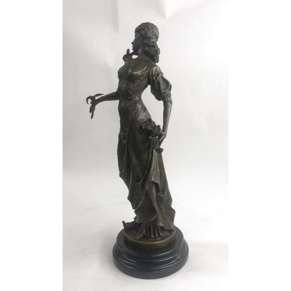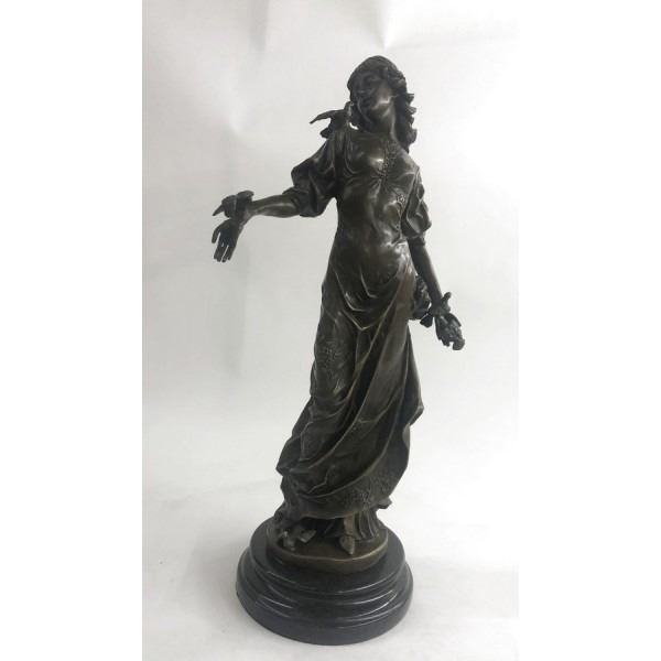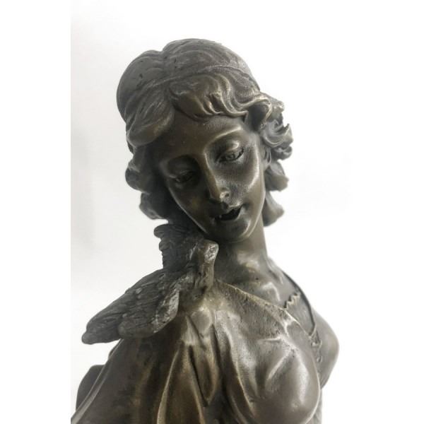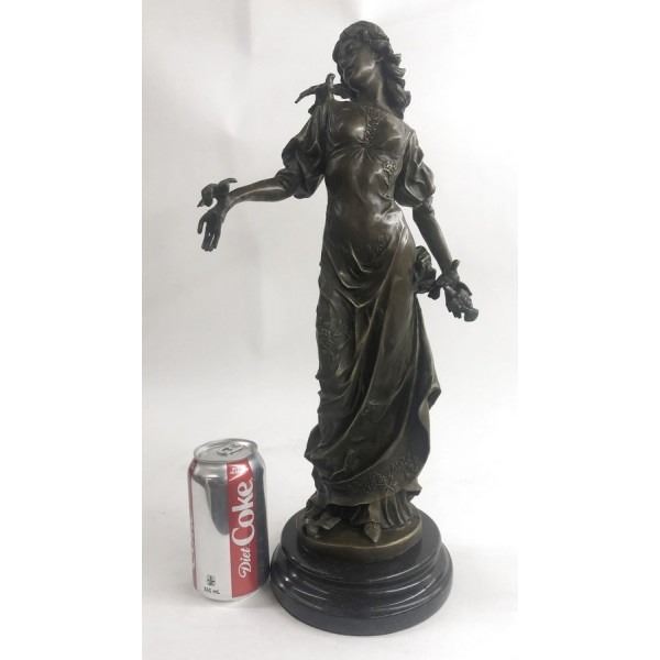 his bronze elegance recalls the ancient art of Classicism as she stands in a natural contrapposto pose. The viewer can immediately sense a feeling of pure warmth and compassion that comes from the essence of this figurine. Her weight falls to her right side as her corresponding hand cradles softly to her cheek a befriended mourning dove. Her head tilts sinisterly as her saintly face warmly smiles down upon the dove perched on her left arm. The lost-wax method of casting creates the skill of the artist to come through in the details of her long, falling dress. She is stained with a brown patina tarnish and stands mounted up a marble base. Dimensions: Height 18 X Width 8 inches. Weight: 19 LBS.