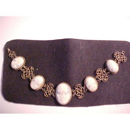 </font></strong>You are getting 5 wonderful old cameos set in a wonderful victorian fillagree bracelet measuring 7.5". The big cameo in the center measures 1" X 3/4" and the 4 smaller cameos measure 3/4" X 1/2". It is really very lovely and feminine. I can't find any markings and am assuming this to be either brass or silver with gold wash or some combination of that. I would say this is very old. All is in good condition.</font>