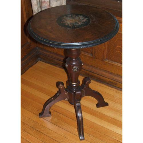 American. Victorian. Late 19th century. Mahogany. Nice small Aesthetic Movement stand with a molded round top and arched tripod base with ebony gold trim. 29" high X 18" diameter.