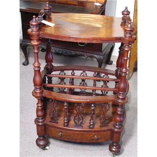 RARE English Burl Walnut Canterbury with shelf and drawer. Heavily carved, all original including porcelain casters. Fine patina excellent condition. Originally for sheet music probably now used as magazine rack and side table. c.1875