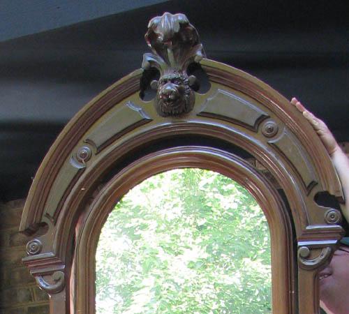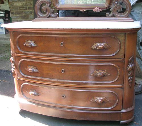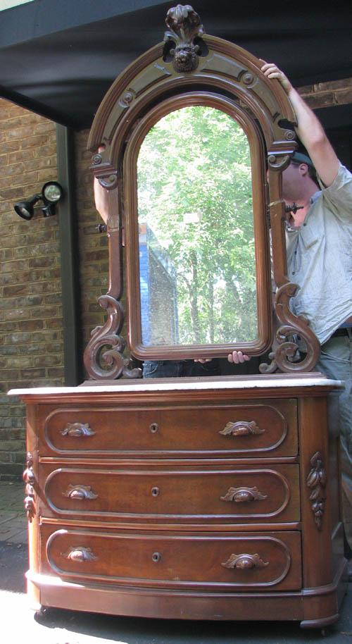 Title: Victorian Carved Chest of Drawers with Mirror, floral applied decoration and scallop carved handles, marble top, carved mirror frame with lion finial