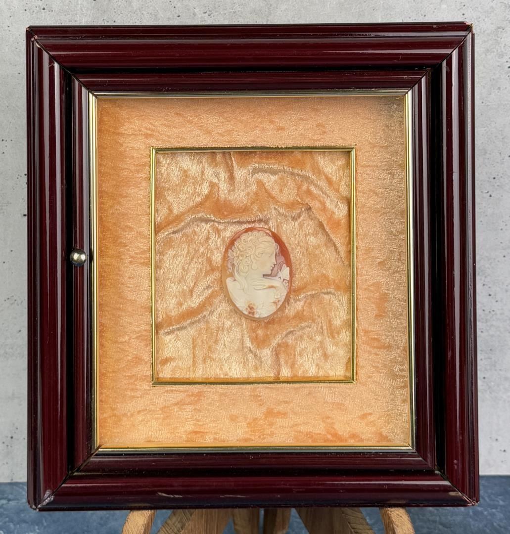 10 1/4" long, 9 1/2" wide, 2 1/8" thick framed. Cameo is loose on the cloth.
