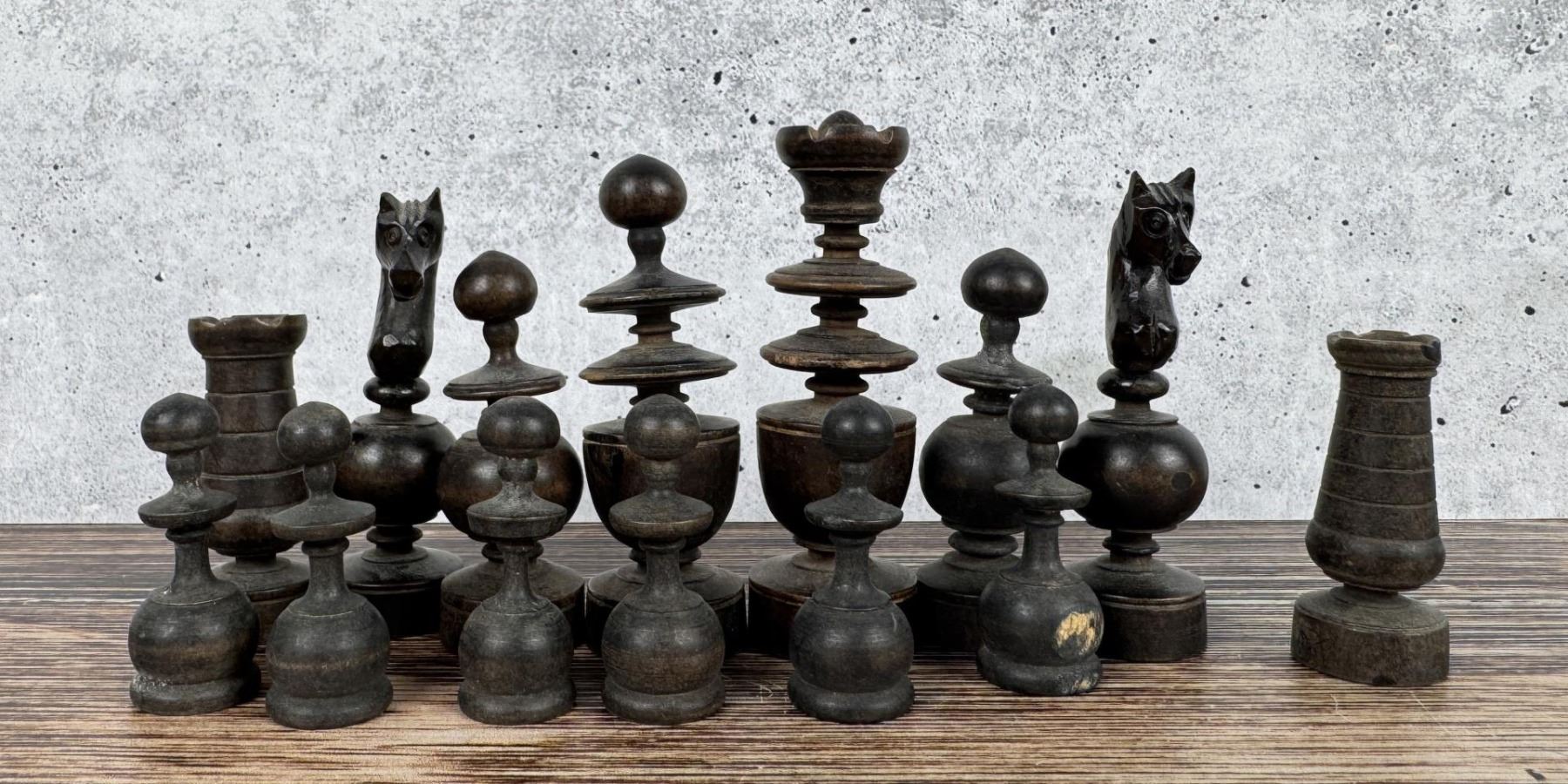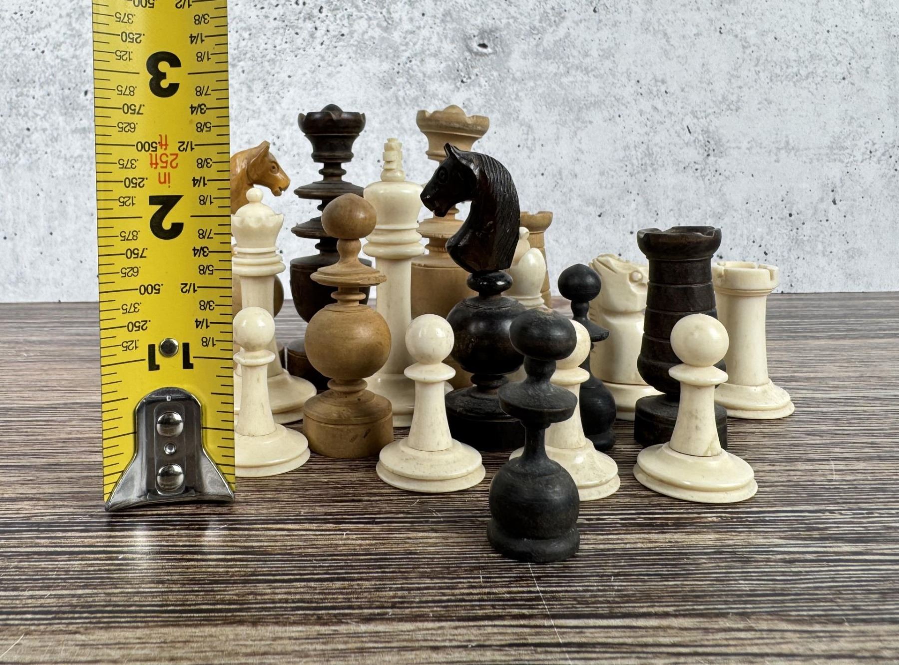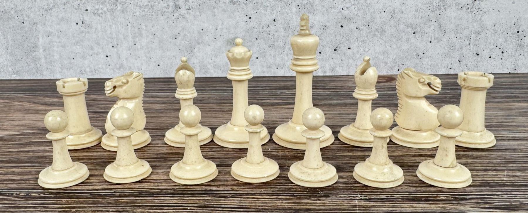 Nice Grouping. Dark wood set is missing 2 pawns, light wood set is missing knight, bone set is missing a pawn.