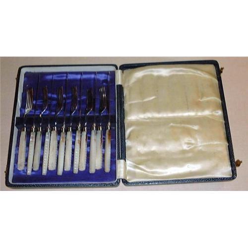 For sale is a great, fancy Victorian cased set of 6 knives and 6 forks. The mother of pearl handles are carved and etched in a delightful pattern. I would say the set is for fruit/cheese course or for dessert. The knife has a blunt end and is 7 5/8" long. The fork is 6 1/4" long with sharp teeth. It comes in a faux shagreen case with silk and satin lining.<p>US SHIPPING INCLUDES DELIVERY CONFIRMATION.