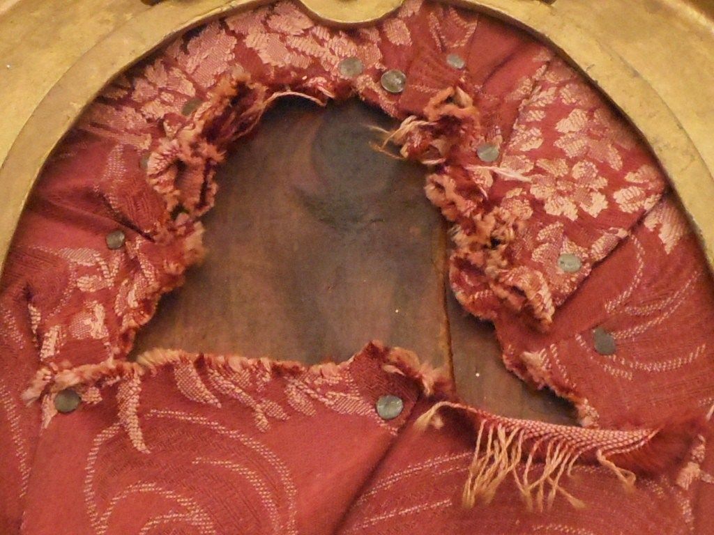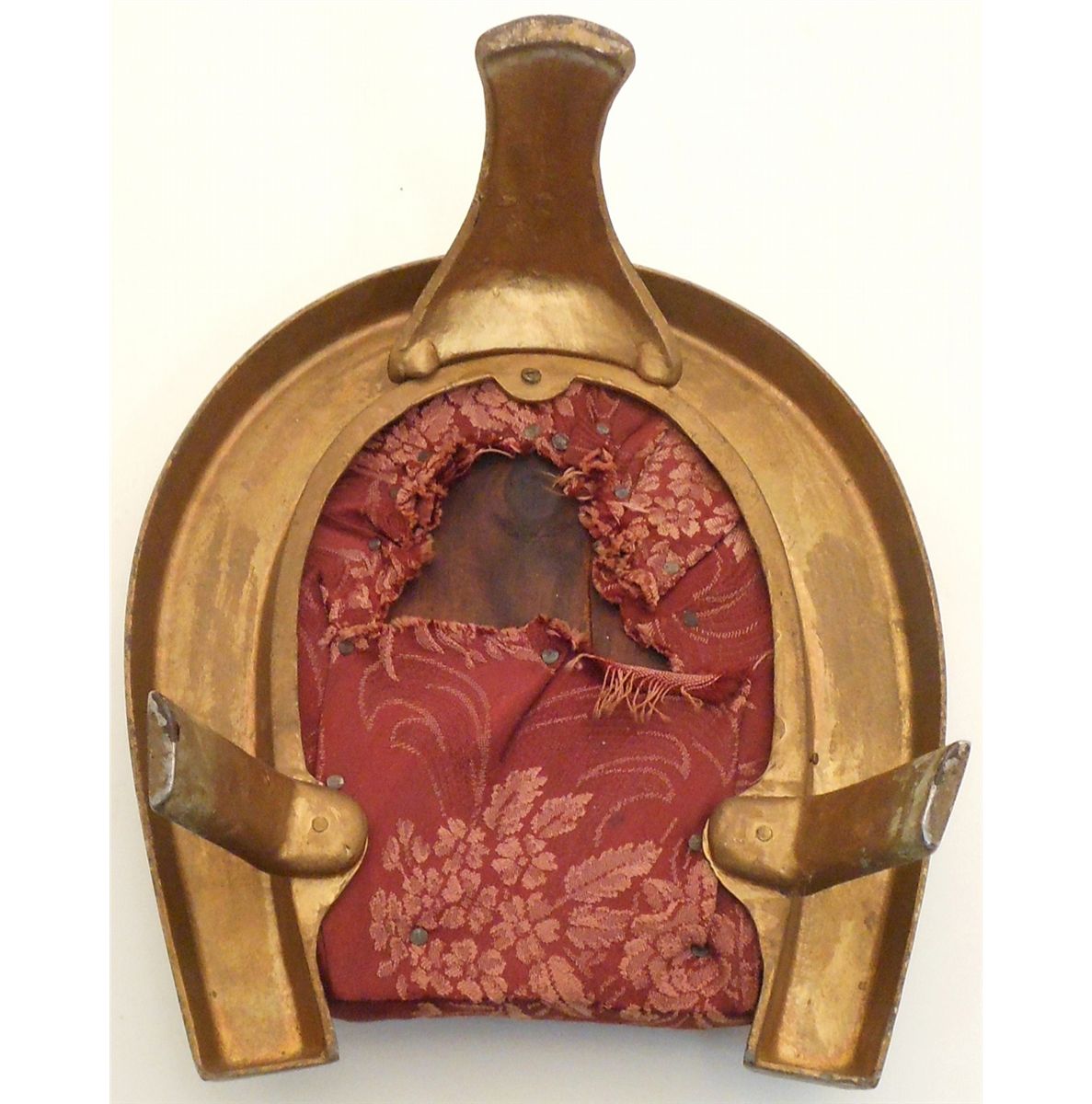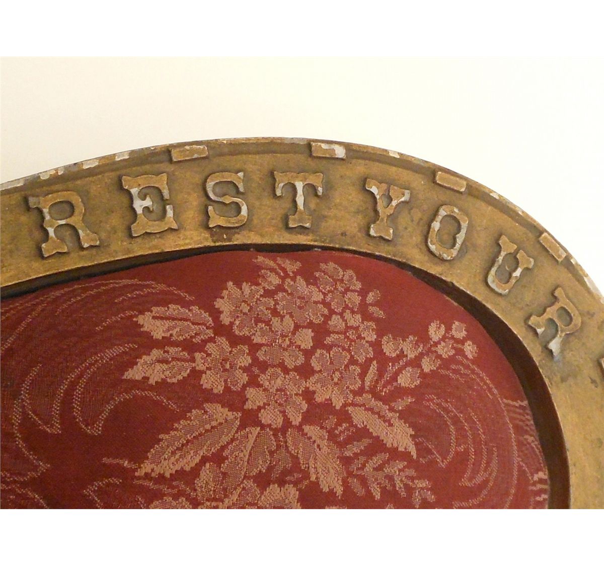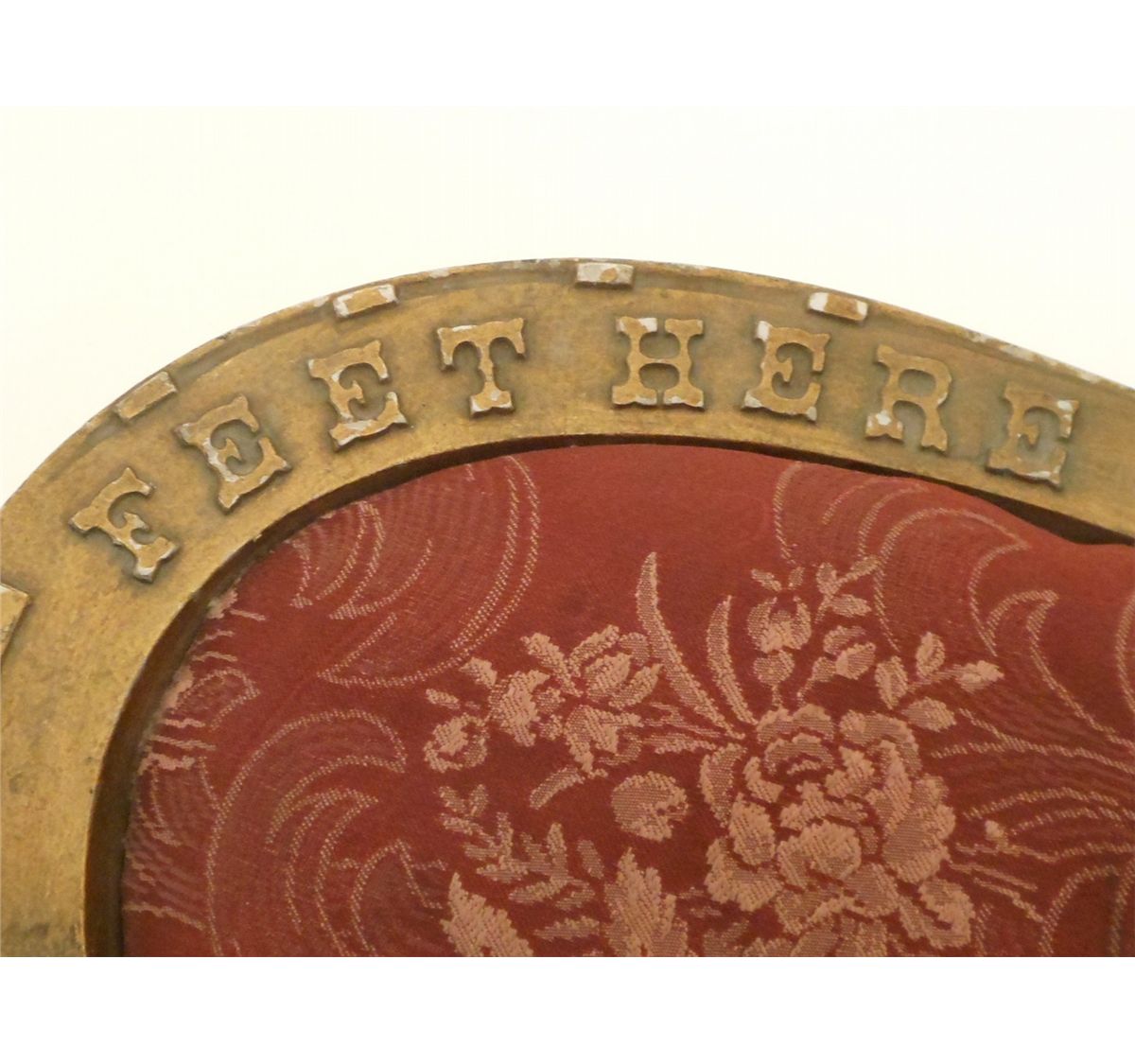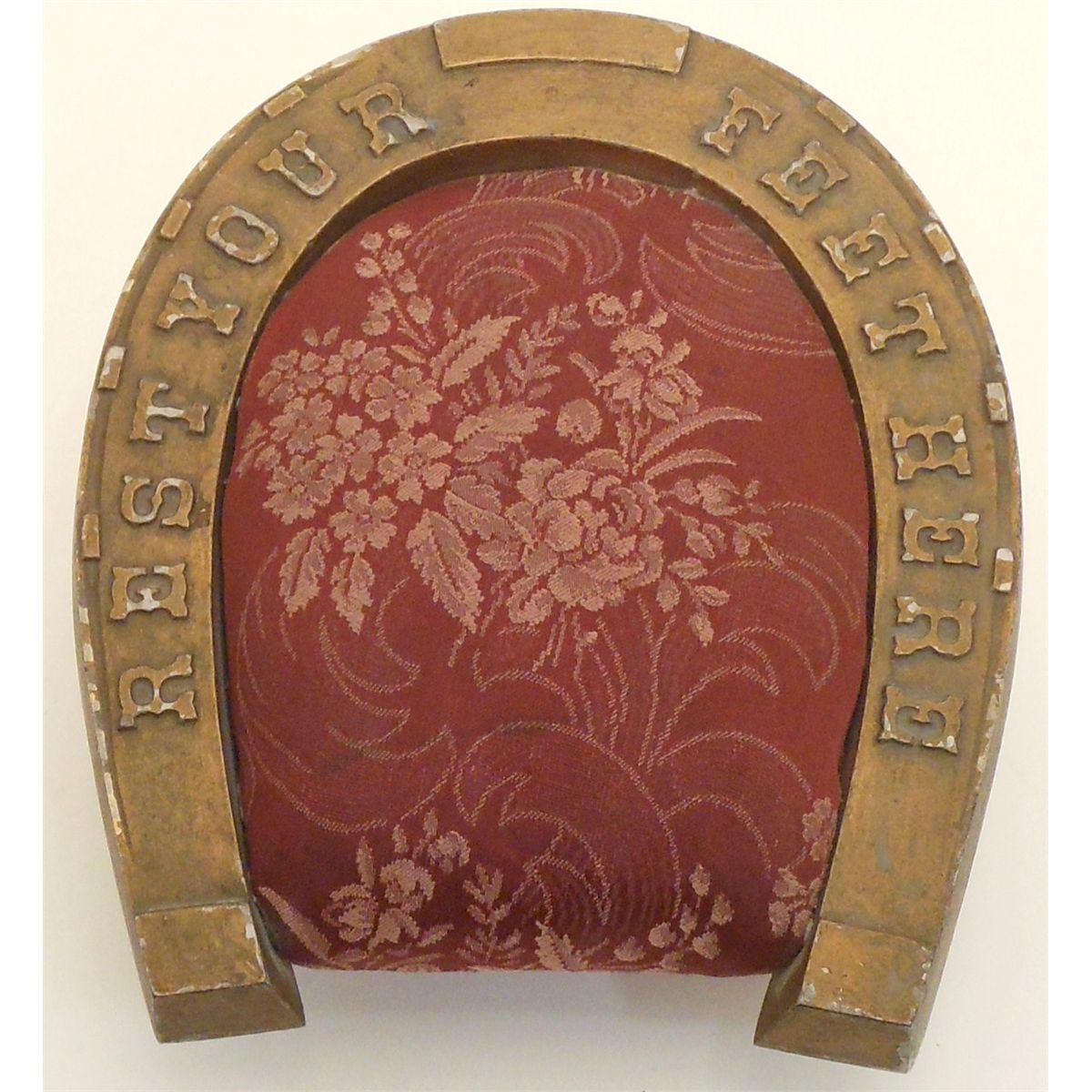 12" X 10 1/2" and 5 3/4" Tall. Victorian Cast Iron Foot Rest in the shape of a Horseshoe with the saying, "Rest Your Feet Here". Wood Center covered in red floral material. Great Condition with some wear. (see pictures)
