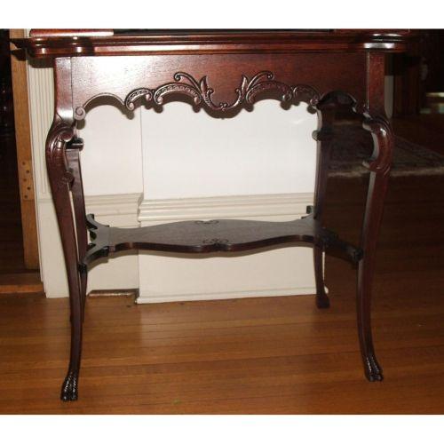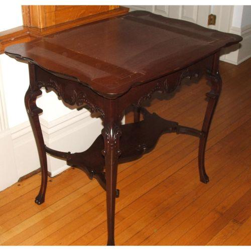 American. Victorian. Late 19th century. Mahogany. Nice Rococo Revival table with a shaped top, a floral scroll carved skirt on cabriole legs with carved knees, joined by a shaped shelf stretcher. 30" X 33" long.