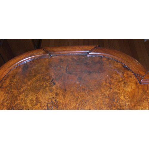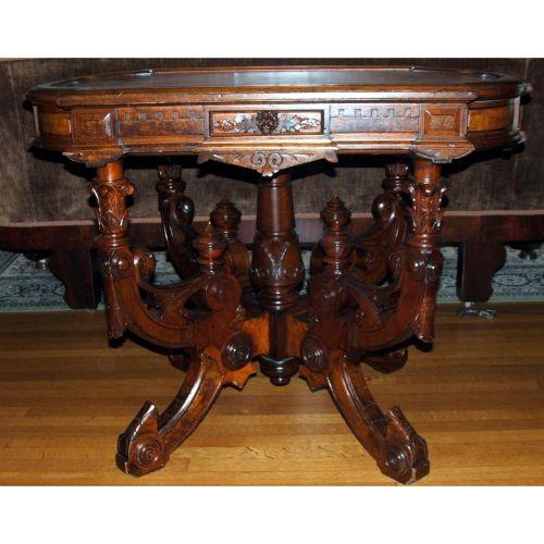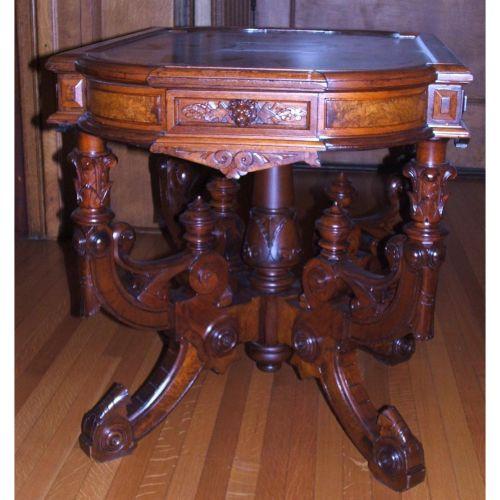 American. Victorian. Mid 19th century. Walnut with burl.Fine Renaissance Revival center table with a cartouche shaped top, shaped shirt trimmed with burl panels and an applied carved lion's head.Some light veneer and finish damage to the top. 29 1/2" X 36" long.
