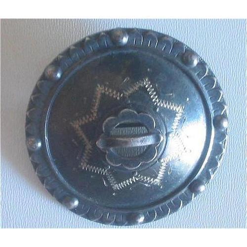 A very unique Victorian brooch of chased silver, reverse etched, slightly domed, with an eight pointed star etched around an open scalloped centre that has a horizontal bar across. Measures 1-1/4" inches in diameter. Excellent condition, old style "C" close.