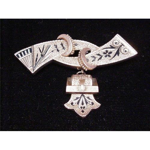 Attractive lady's Victorian Circa 1890 10kt Yellow Gold and Black enamel tracery brooch/watchpin with buckle style dangle in fabulous condition. Dangle detaches so brooch may be worn alone or with something else hanging off of it. Great condition!! Wonderful size! Tailored look. Reverse - tube hinge, c-catch and hook all original!!! What a wonderful piece of Victorian jewelry!