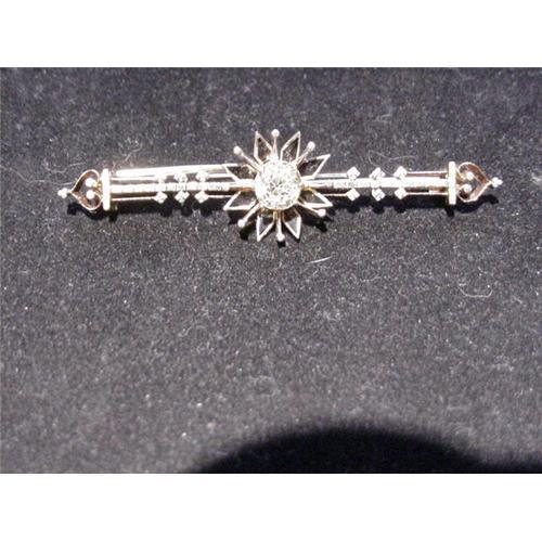 Spectacular Victorian circa 1900 diamond and 14 Kt yellow gold bar pin with original stabilizer bar, tube hinge, c-catch set with approximately .90 ct Old European Cut - VS clarity, yellowish color diamond with black enamel accents on petals of flowers.