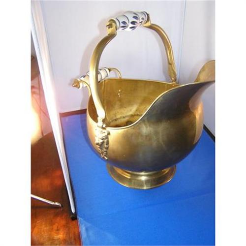 Old Coal Bucket of brass with Delft Handles . The seams are silver-soldered, and the attachments are made with copper rivets. It is decorated with lion heads. There is a small crack in the base. This would make a fine addition to a contemporary fireplace.