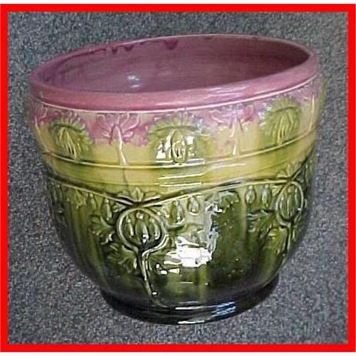 This Victorian Majolica pottery jardiniere has wheel-thrown marking inside and molded outside. Actual size is 9-1/2" tall and 11" in diameter. There is a rose colored glaze inside and over the rim with different shades of greens toward the base. There is heavy pooling glaze on the bottom; so I cannot see any maker's marking. Good condition with typical pinholes, roughness in the molding and uneven glazing that is in majolica pottery. No chips with stilt marks on bottom. I bought this at a local estate sale.