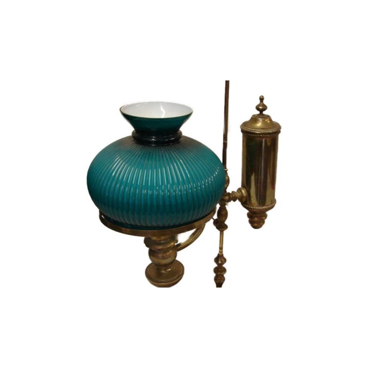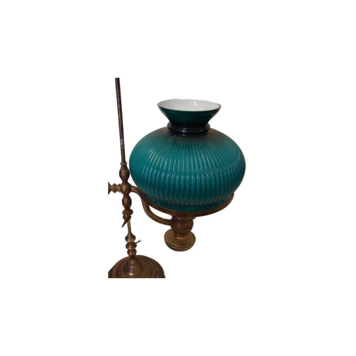 Nice heavy weighted Brass Stand. Gorgeous ( 10" D X 8" H ) Teal Glass Globe. Lamp on adjustable, moveable Arm. Converted for electric use. 31" H overall.