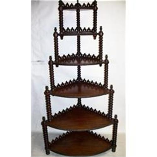 A grand & glorious 19th century Étagère or AKA a What Not Stand .This one is a beauty, made of rich Mahogany, with elegant turnings & a rich & mellow surface patina .What a rare find these days! The condition is excellent, no repairs or breaks & the finish is original. It is a corner stand & it measures 60? high to top of finial x 29? wide at the bottom x 14? wide at the top x 17 ½? deep bottom shelf x 71/2? deep for the top shelf .Dating from the middle 1800?s.