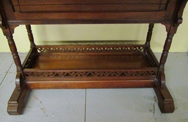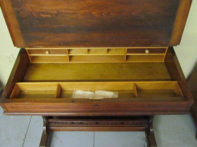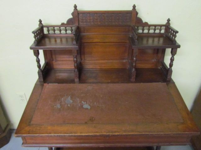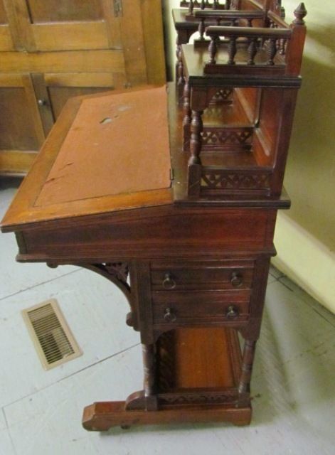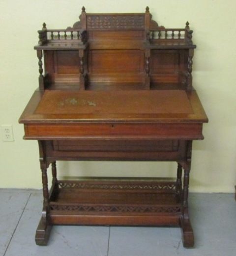 Victorian Renaissance Revival Davenport Desk - Walnut and Burlwood, spool carved galley above slant front writing surface, opening to ink well and pen holders - 2 drawers on either side, on projecting feet - 48" x 32.5 " x 22"