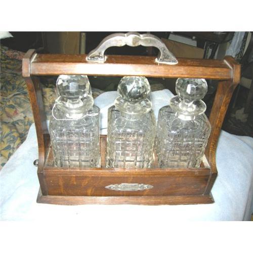 </font></strong>WE offer a late Victorian or Edwardian oak tantals with metal fittings and three decanters in crystal. The tantalus to the top of the handle measures roughly 13.5 inches tall and the item is itself 13.5 inches long and 5 inches deep.