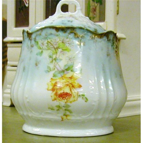 </font></strong>Lovely porcelain Victorian style biscuit cookie jar - white with aqua and yellow.  Roses and daiseys with gold trim.  Minor paint loss.  Buyer pays shipping and handling costs.</font>