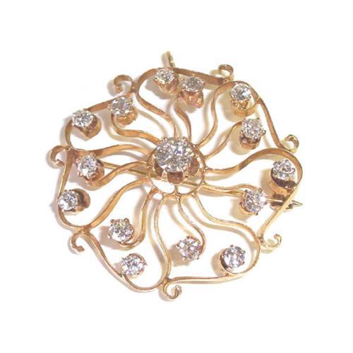 This lovely antique brooch is made from 14k gold and features 15 diamonds. This piece was likely made circa 1900 and features a Victorian style. Measures 1.5" across and its penny weight is 6.3 dwt. Gold is inscribed "14K". Center round brilliant-cut diamond measures 5 mm across with an estimated carat weight of just under 1/2 of a carat. The other 14 round brilliant-cut diamonds measure 3.5 mm across with an estimated carat weight of 1/8+ carats each. Total estimated carat weight is 2 1/4 carats. Working clasp. Ring swings up to allow it to be worn on a necklace. Thanks for visiting, and please let us know if you have any questions or comments!