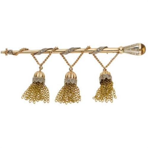 <B>Victorian Diamond, Citrine, Gold Brooch</B></I><BR><BR>The brooch features three tassels suspended from a yellow gold bar wrapped in white gold, enhanced by native-cut diamonds, accented by a round-shaped citrine cabochon terminal, set in 14k gold. A pinstem and catch complete the reverse. Gross weight 11.40 grams<BR>Dimensions: 3-5/16 inches x 1-1/4 inches<BR><BR> <B>Condition Report:</B> Good condition. One diamond is missing.<BR><BR><BR><b>Shipping:</b> Miscellaneous Collectibles, Smal (<a target="_blank" href="http://www.heritageauctions.com/common/shipping.php">view shipping information</a>)