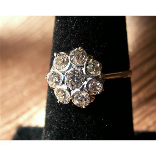 This dazzling diamond ring consists of eight diamonds. Seven are approximately .15 carats while the center stone is .20 carats, for a total of 1.25 carats. The mine cut diamonds are clear and very white. Stones are set into white gold; shank is yelllow gold, size 7 1/2". This ring is a real show stopper in the sunlight and is very comfortable.