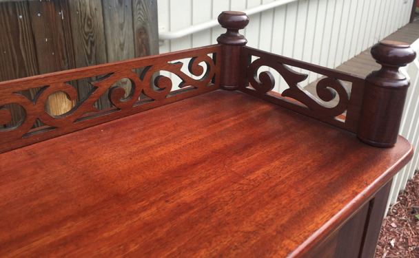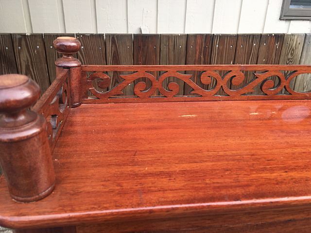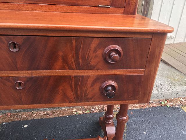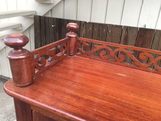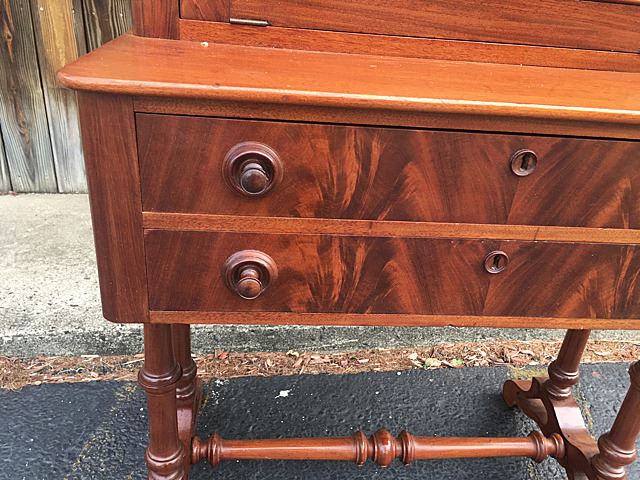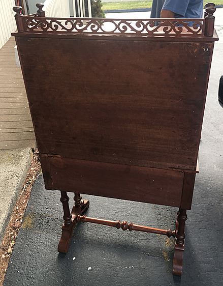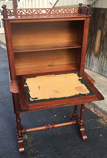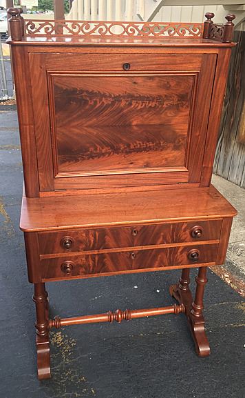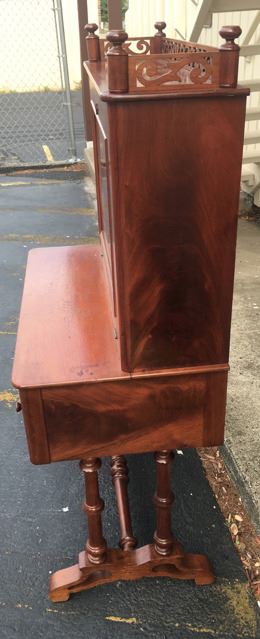 Victorian Drop Lid ladies Secretary Desk. Very nice Victorian drop lid ladies secretary with carved gallary, burling on drawer faces and drop lid, 2 drawers, opens to reveal 2 shelves, writing surface. Measures approx. 51" tall x 29" wide x 17" deep.