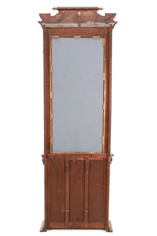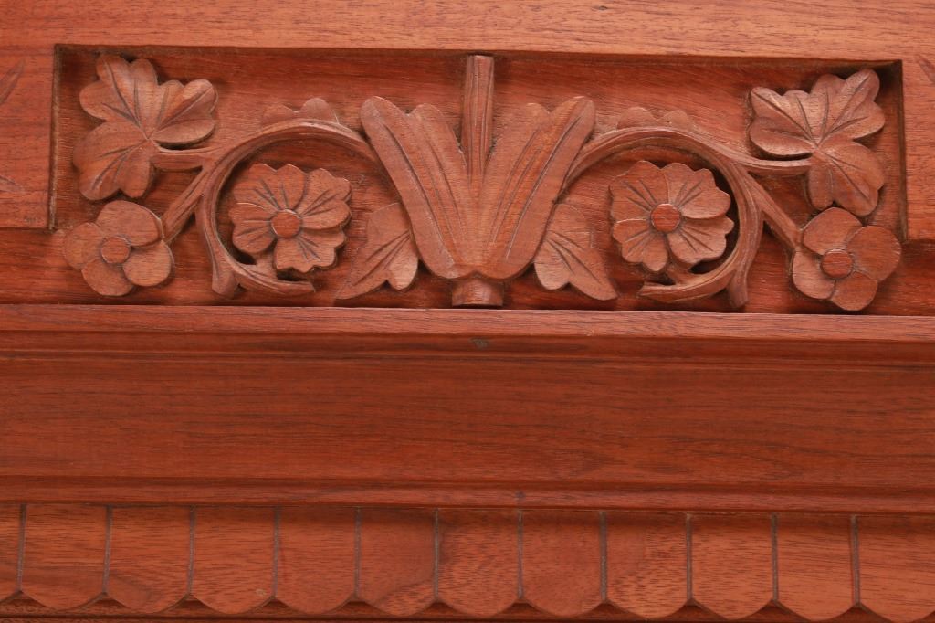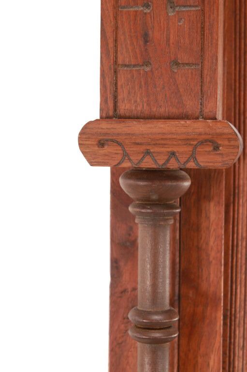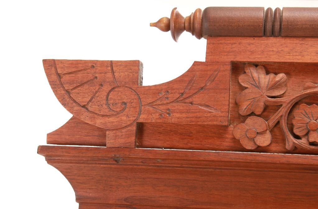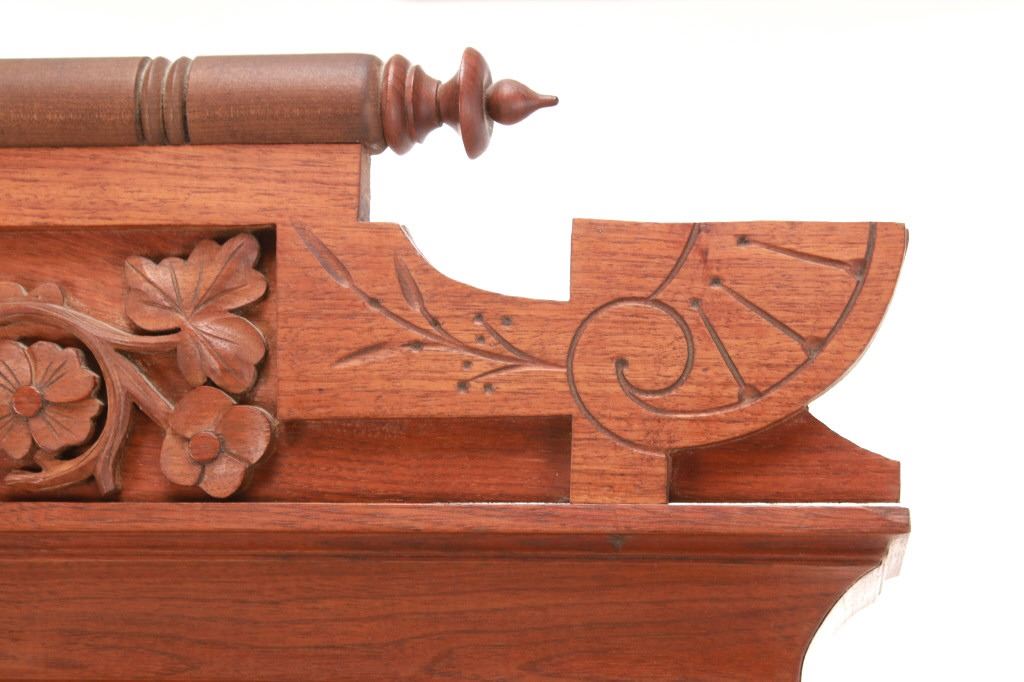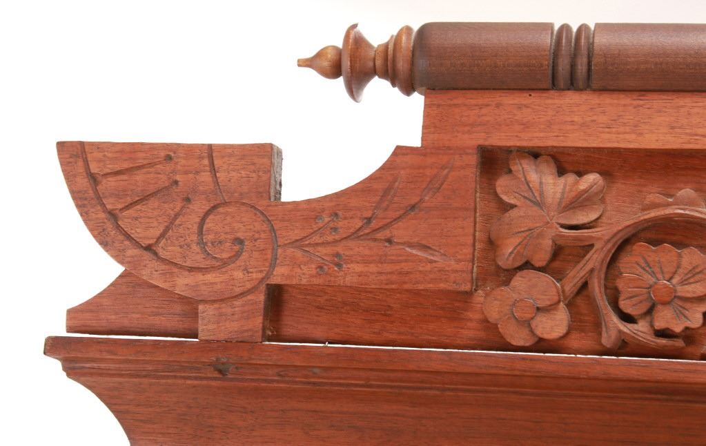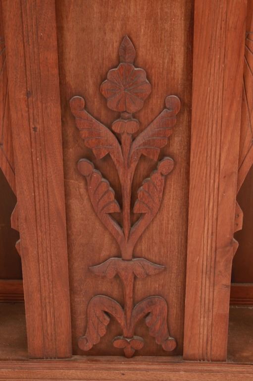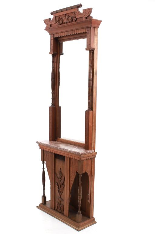 Featured in this lot is a Victorian Eastlake Hall Mirror with a Marble shelf. The Eastlake movement was a nineteenth-century architectural and household design reform movement started by British architect and writer, Charles Eastlake. The movement is generally considered part of the late Victorian period in terms of broad antique furniture designations. This piece features intricate spoon carvings of leaves and flowers on the crown, deep rich oak and cherry tones. Dentil moldings are shown above the mirror and below the marble. There are turned wood balusters sandwiched between plinth blocks above and below the mirror. Flat panels are incised with decorative designs. Carved thistle is shown on the lower front panel. Absolutely splendid piece that will enrich any antiques collection and add a touch of elegance to any interior. Hall tree is in amazingly nice condition especially for its age, scratches and slight scuffing consistent with age and use. Measures 80"H x 27"W x 10"D.*