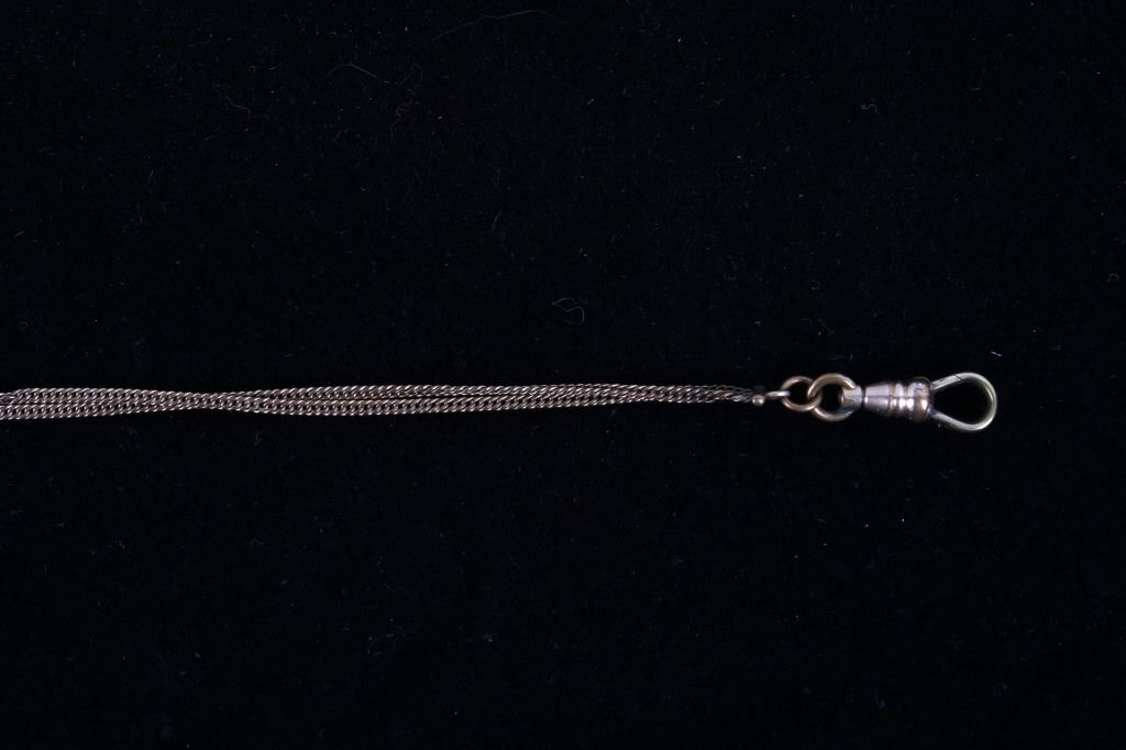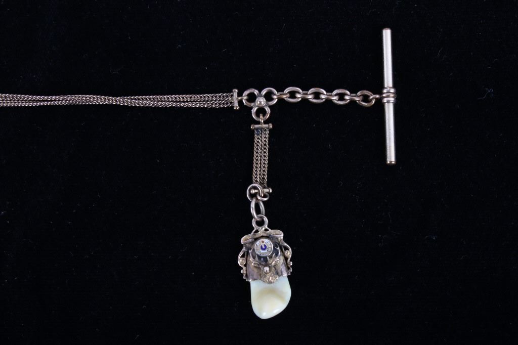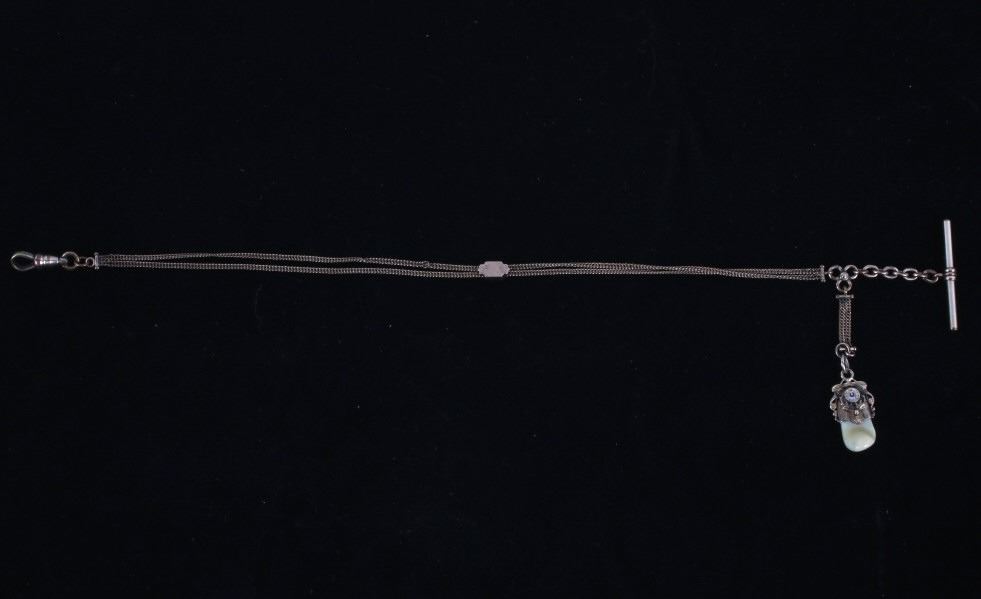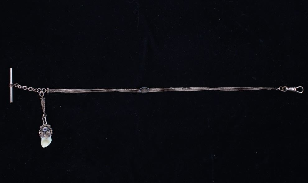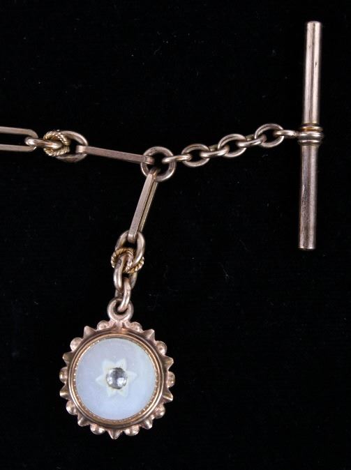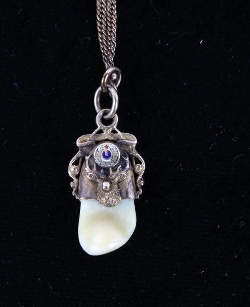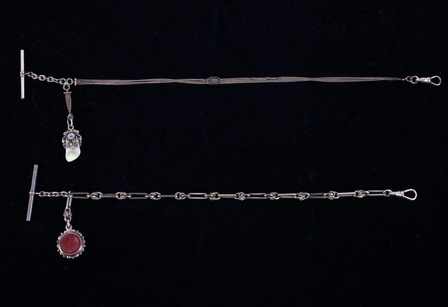 For your consideration in this lot is a collection of two antique pocket watch gold wash or fill chains and fobs. The first is an elk ivory tooth with the FOE (Fraternal Order of Elks) eleventh hour clock on it. The fob is an elk ivory tooth capped with an elk head and the eleventh hour clock and intricate scroll work. The slide on the chain is missing its back.  The chain measures 12 1/2" and has a 1 3/4" cross bar. The fob hangs on a 1 1/2" drop chain. The hook has the initials D & C. The next is a 10-14K Gold (acid scratch test) chain and fob. The chain is made of large rectangle links with twisted rope accent links. The chain measures 11" with the cross bar on a 1/2" drop. The fob has a cracked orange cabochon on one side and a six point star with a Mother of Pearl stone in the center on the other side. The hook has the initials of C.L.T. This chain and fob have a total collective weight of 26.8g. Content not test.
