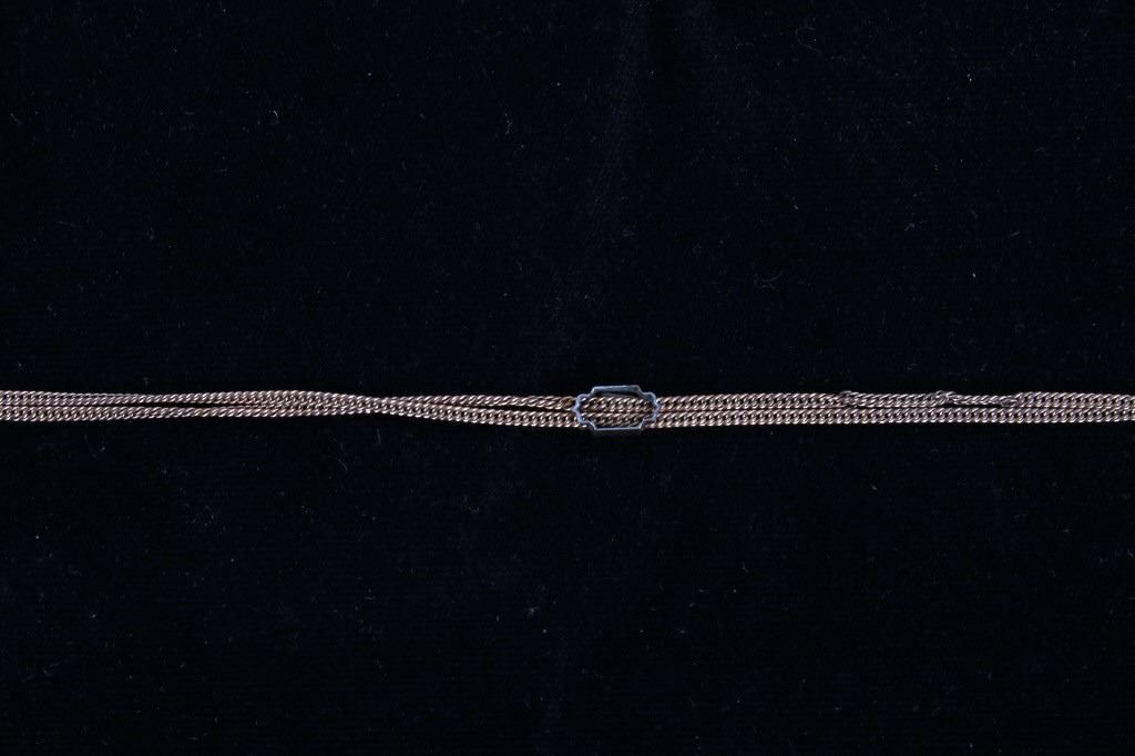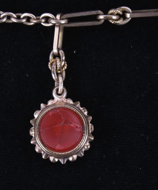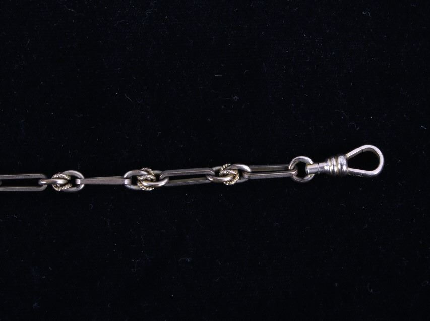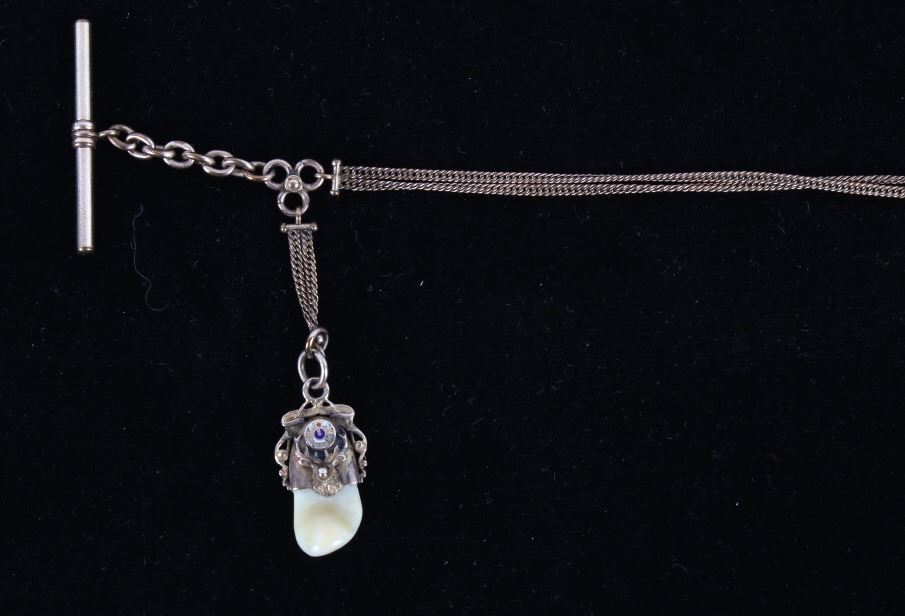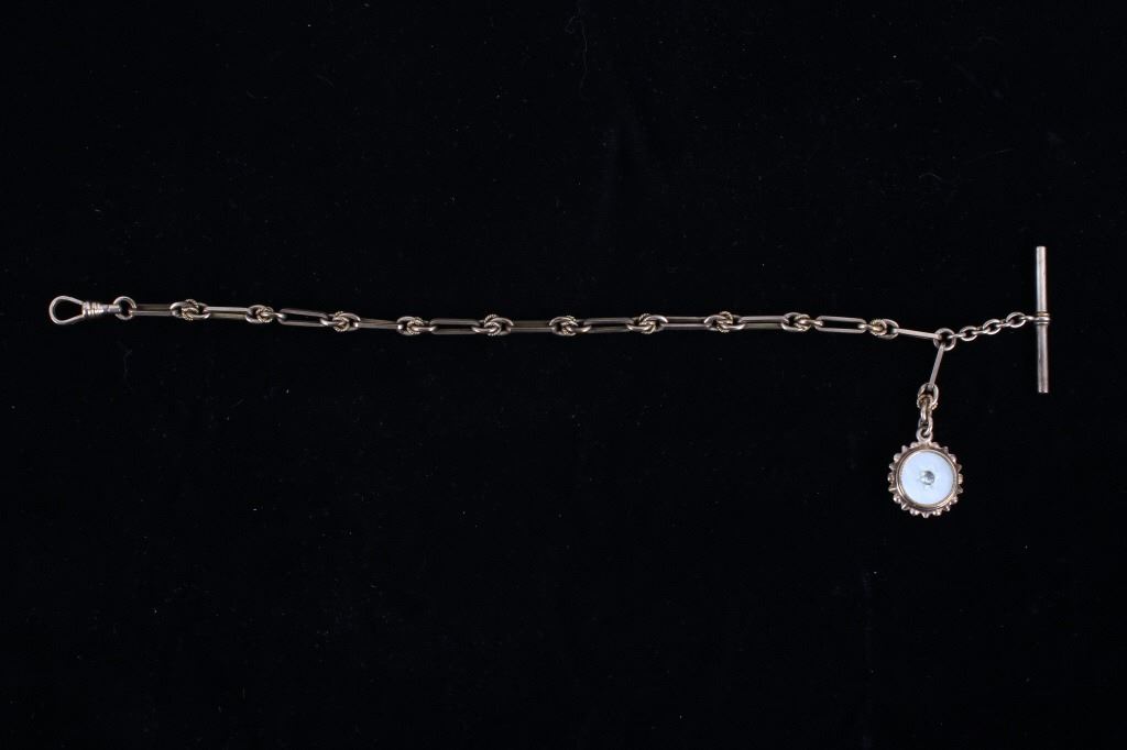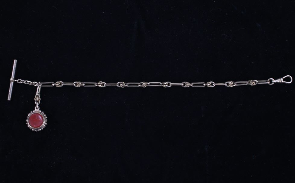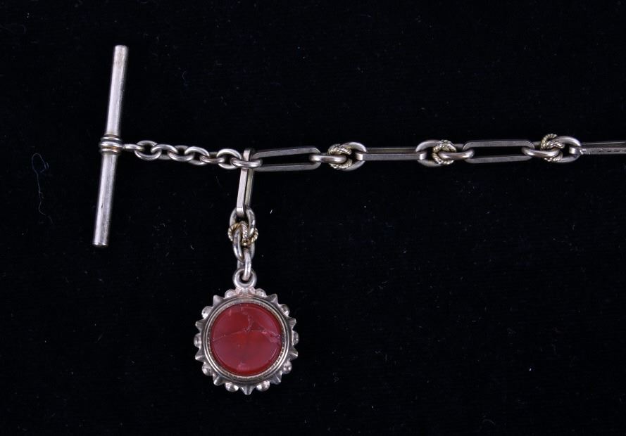 For your consideration in this lot is a collection of two antique pocket watch gold wash or fill chains and fobs. The first is an elk ivory tooth with the FOE (Fraternal Order of Elks) eleventh hour clock on it. The fob is an elk ivory tooth capped with an elk head and the eleventh hour clock and intricate scroll work. The slide on the chain is missing its back.  The chain measures 12 1/2" and has a 1 3/4" cross bar. The fob hangs on a 1 1/2" drop chain. The hook has the initials D & C. The next is a 10-14K Gold (acid scratch test) chain and fob. The chain is made of large rectangle links with twisted rope accent links. The chain measures 11" with the cross bar on a 1/2" drop. The fob has a cracked orange cabochon on one side and a six point star with a Mother of Pearl stone in the center on the other side. The hook has the initials of C.L.T. This chain and fob have a total collective weight of 26.8g. Content not test.