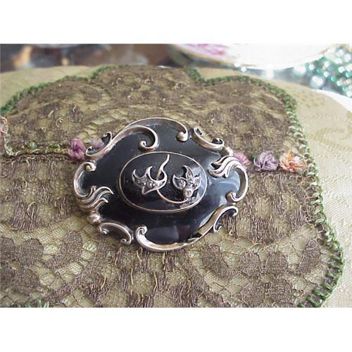 Gorgeous Victorian mourning brooch made of rolled gold and black enamel accentuated with diamonds. The beautiful classical scrollwork is raised and detailed. The centre is in high relief having a pair of intertwined flowers whose heads are filled with diamonds. It measures a very impressive 2 ¼ inches by 1-¾ inches, it has the original c catch working closure and glass compartment, which still holds locks of hair. There was a loop on the back for a safety chain, which is worn in the centre. One tiny portion of the raised gold work is missing with a very minute shallow chip to the black enamel under a flower, which is seen through a jeweler?s loop-definitely not detracting but stated for accuracy, otherwise just fine. This is a high quality memorial brooch is seldom found. Beautiful to wear and enjoy adding to your collection of Victorian mourning jewelryIf you enjoy collecting antique lace and linens, barkcloth, all things roses, Harrison Fisher prints, Shabby Chic, Romantic Cottage and Paris Apartment décor , you may wish to bookmark us since we list often. Thanks and enjoy your day!