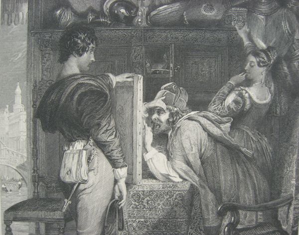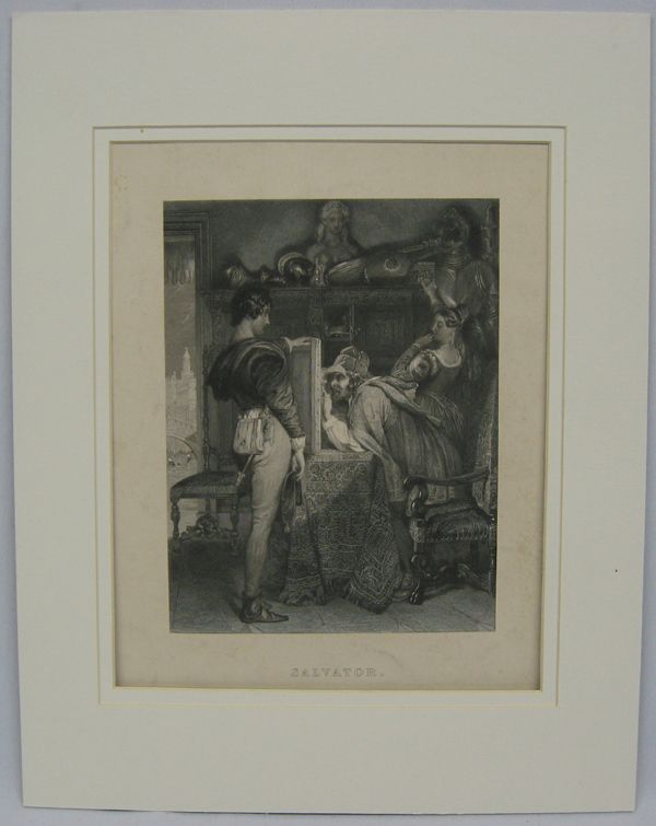 Victorian Engraving ''Salvator'' by Dan Maclise, British 1806-1870. Original title is ''Salvator Rosa Showing His Picture to Masiniello'', engraved by F. Joubert. From the collection by the Right Honorable Earl of Chesterfield. Published exclusively in the Art Journal which was published in London and the most important Victorian magazine on art, founded in 1839. Visual measures 7 1/2'' x 9 1/2'', double matted 11'' x 14''.