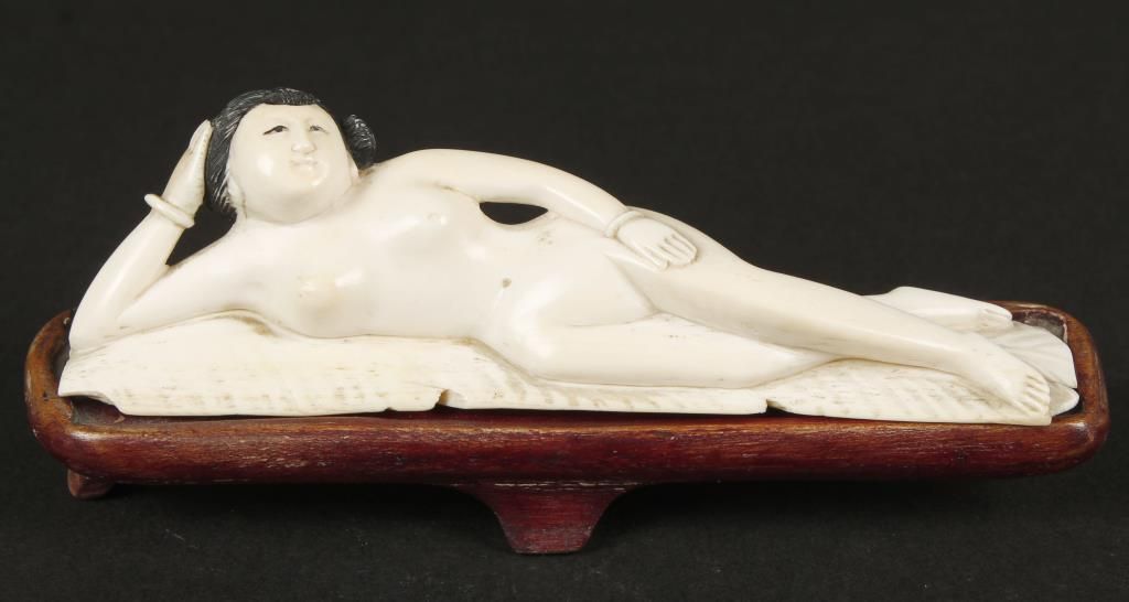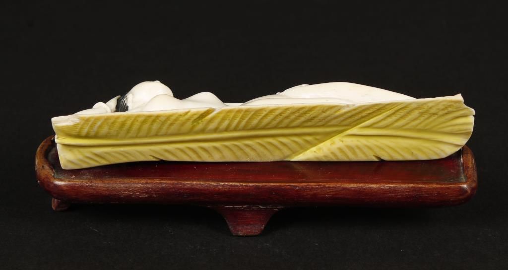 Carved elephant ivory featuring an Asian nude on bamboo mat, with wood base as separate piece. Circa 1880's. In overall good condition except for missing base leg which causes the piece to sit crooked. Approx 5" long x 1-1/2" tall x 1" wide. Can only be sold in the state of Arizona by law & commerce.