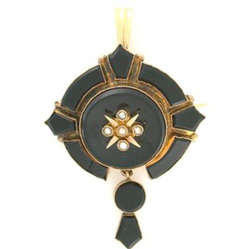 <tr><td>Title:Victorian Era Jet and Seed Pearl Pin/Pendant in</td></tr>