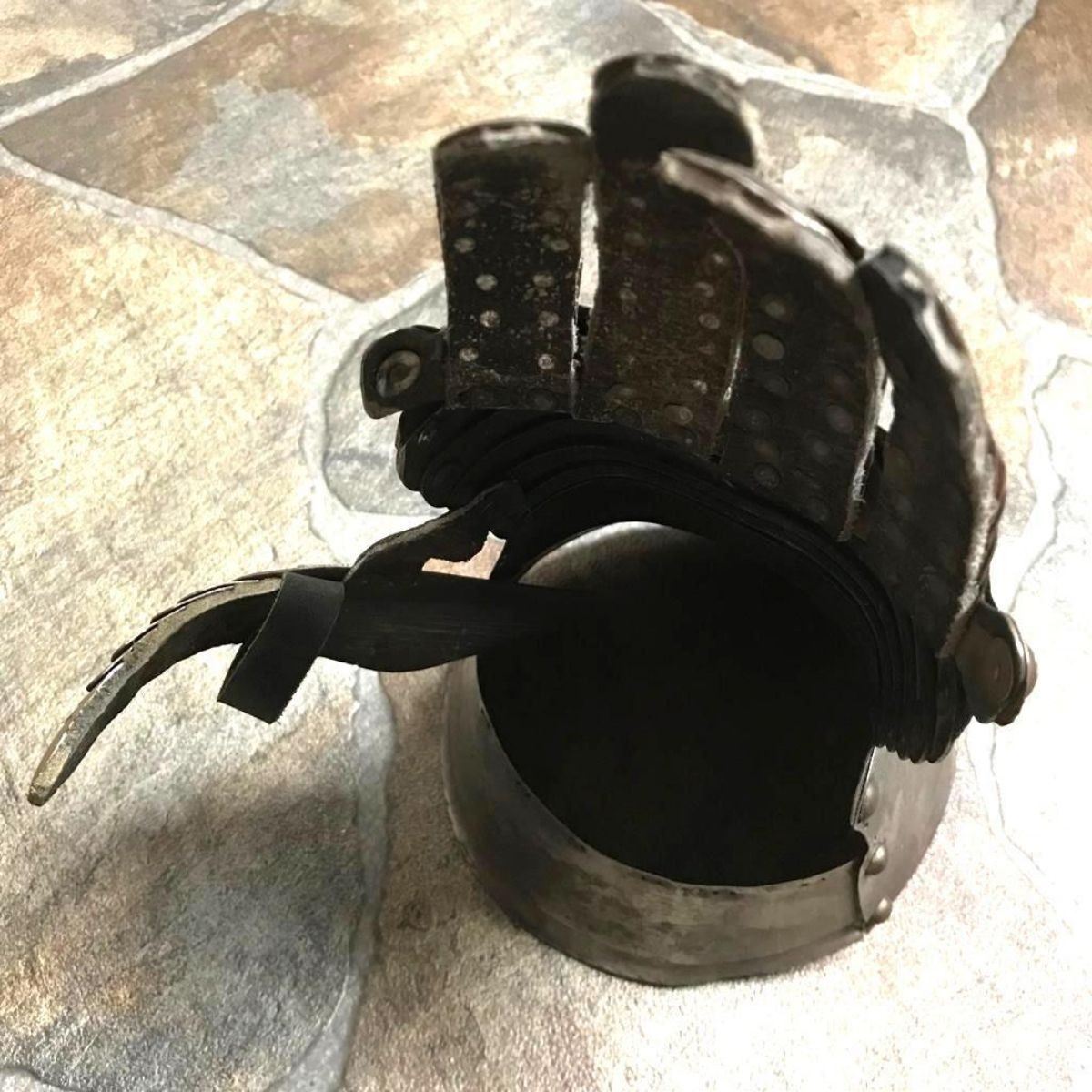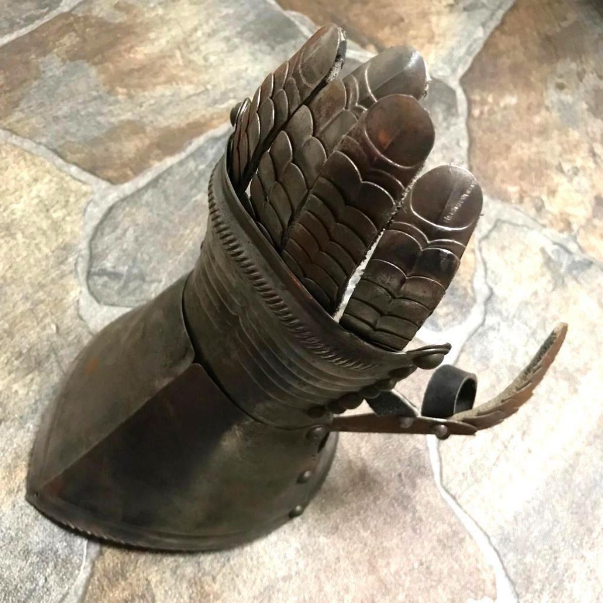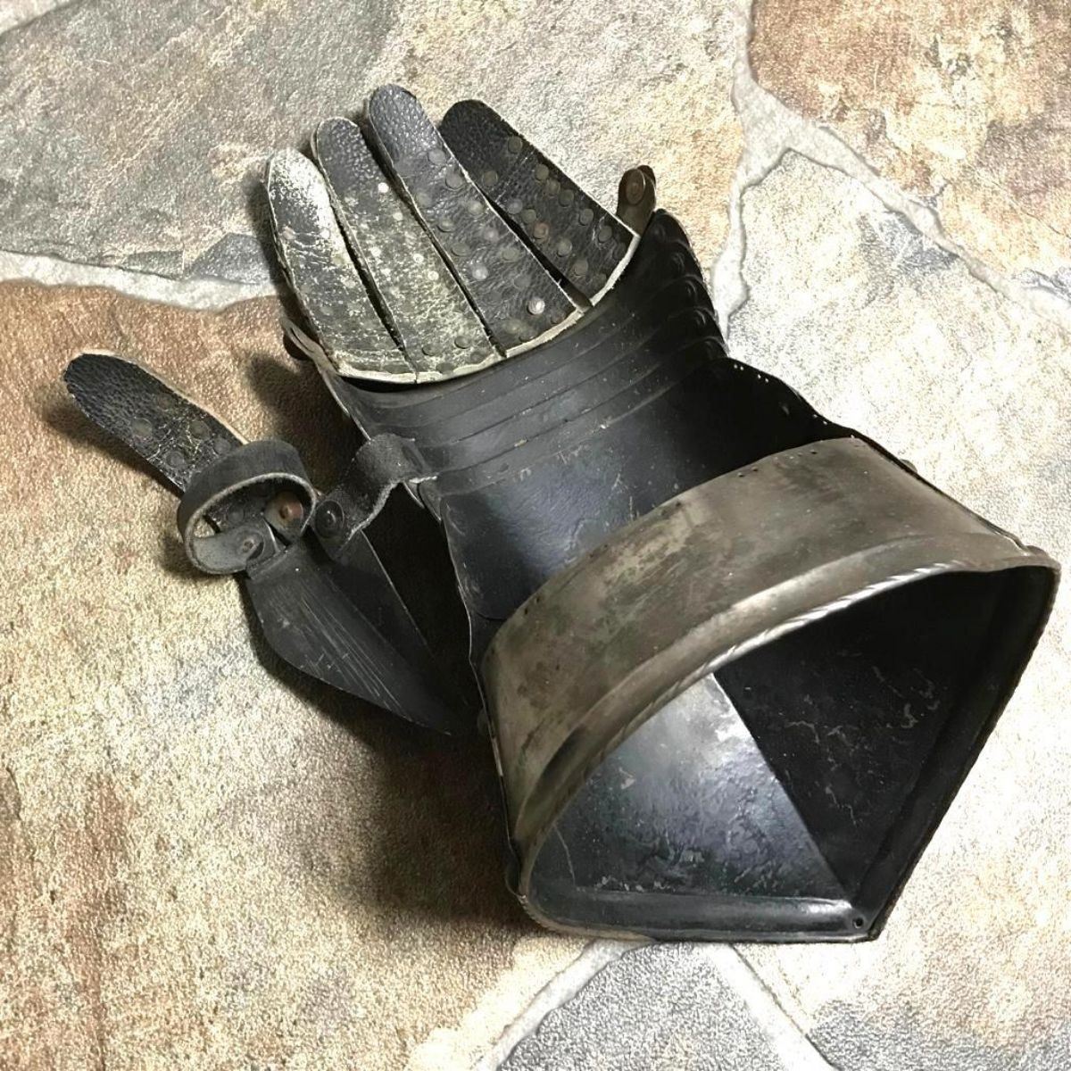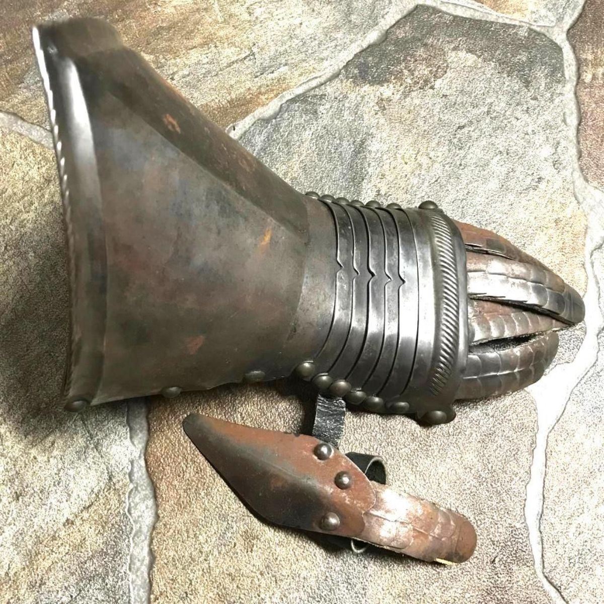 Victorian efa piece of display armor, knight's gauntlet for the left hand. Very well wrought, with individual fingers and thumb, and brass studs. Excellent detail throughout including embossed fingernails. Worn, areas of surface rust. Overall exceptional.