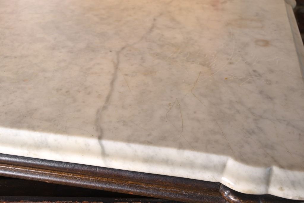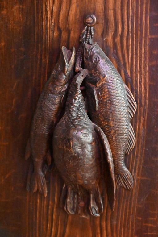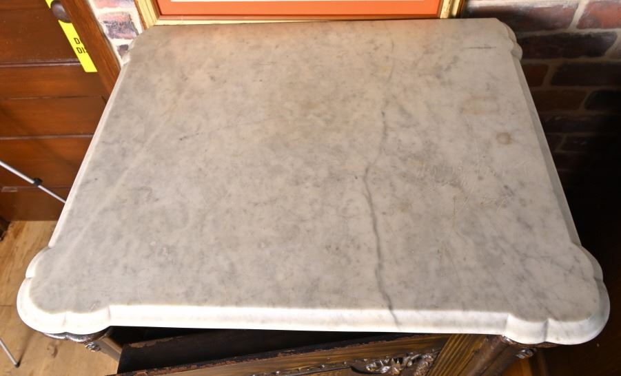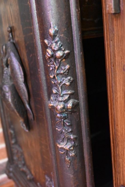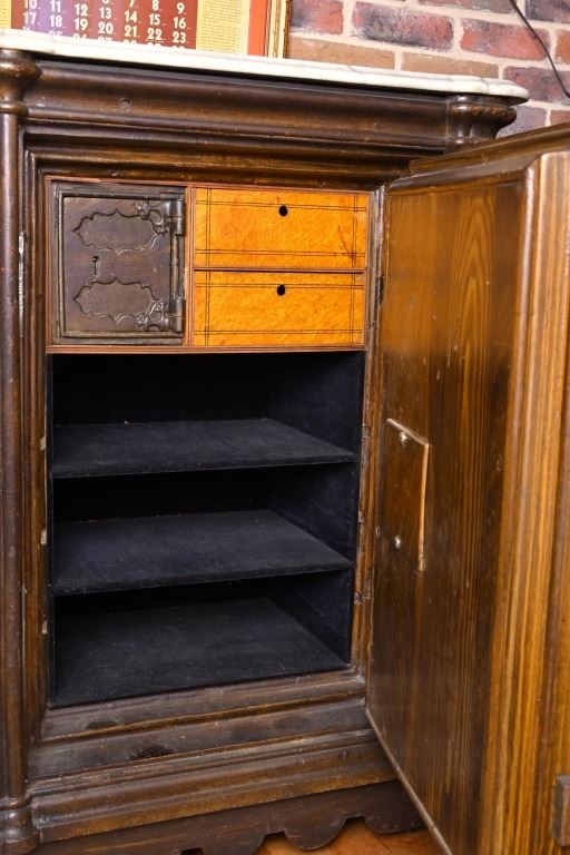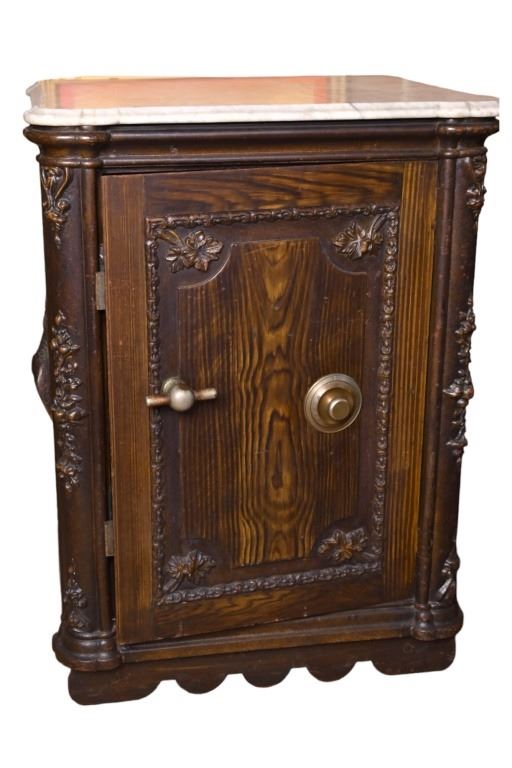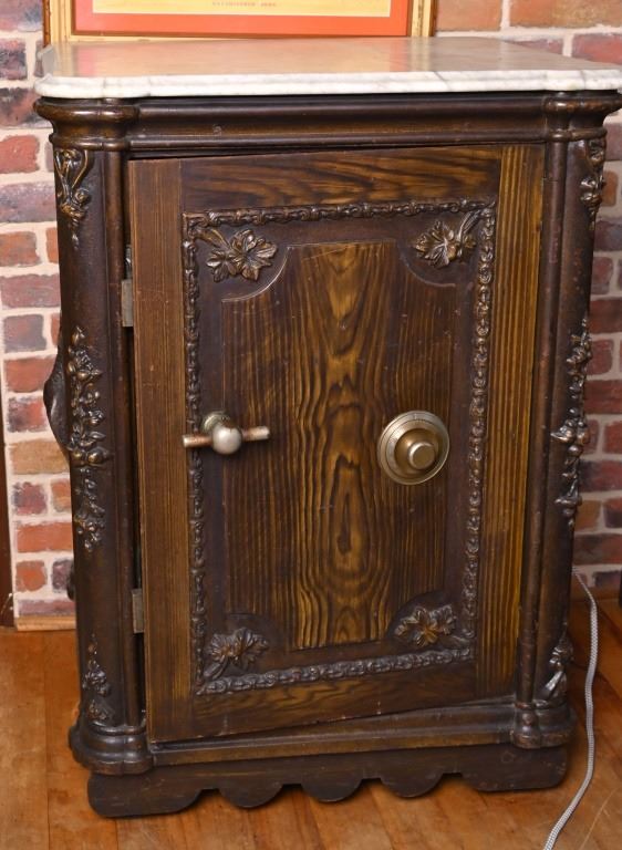 Ornate vintage heavy safe with unique carvings and hunters’ relief depictions on each side. Interior is in great shape with individual maple compartments. Design is made to appear to be wood but is heavy metal. Lock is known to work, but combination is lost. Marble top has no cracks. Measures 23" x 28" x 38"