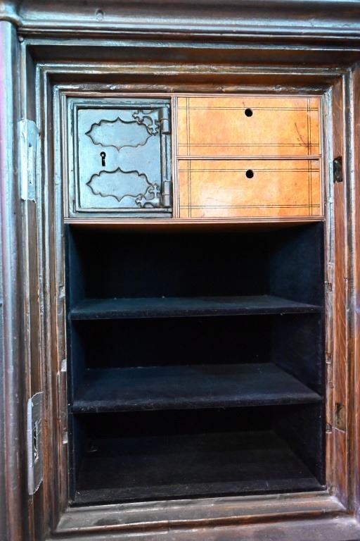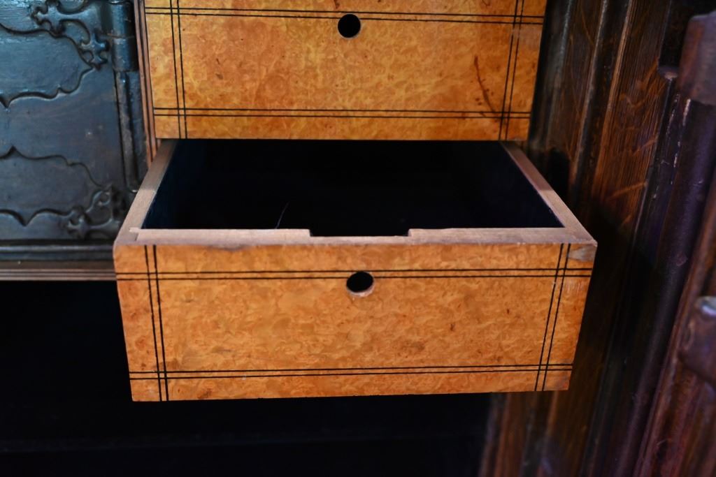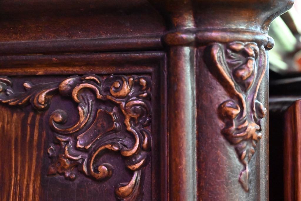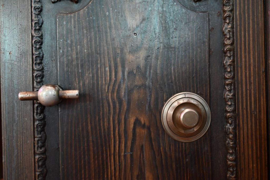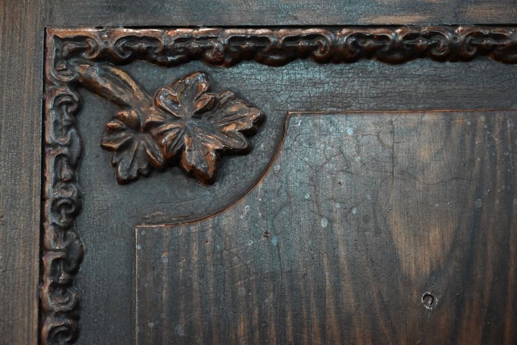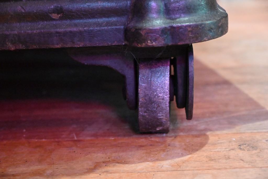 Ornate vintage heavy safe with unique carvings and hunters’ relief depictions on each side. Interior is in great shape with individual maple compartments. Design is made to appear to be wood but is heavy metal. Lock is known to work, but combination is lost. Marble top has no cracks. Measures 23" x 28" x 38"