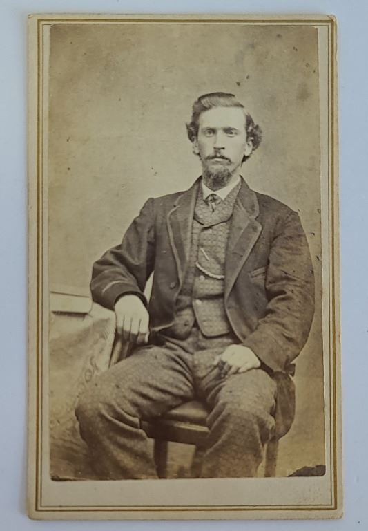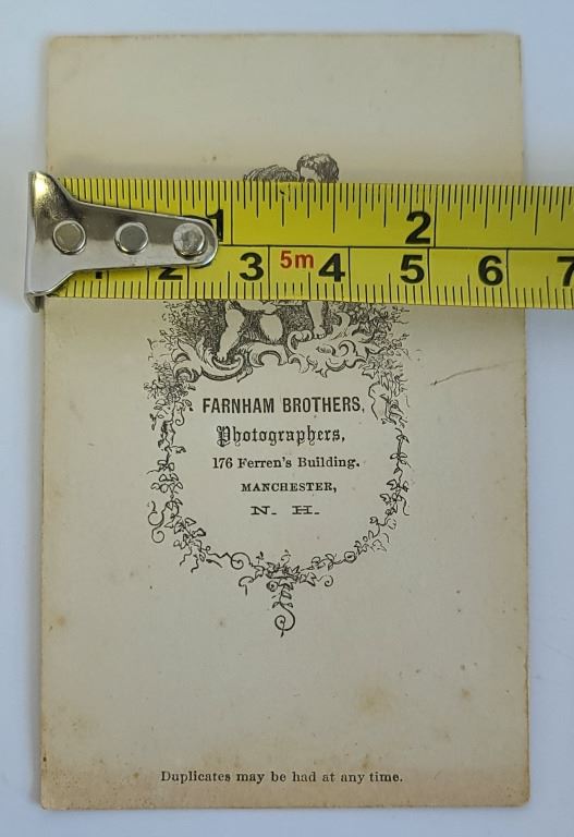 Victorian era photograph portrait of a seated man. Photograph is stamped and was taken by the Farnham Brothers in Manchester N.H.. The photo is on a tan cardstock with gold line border and minor staining to theback.Measurements (4'H*2 1/2'W)4'H*2 1/2'W