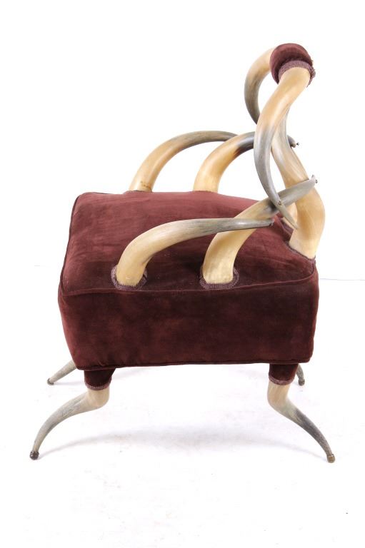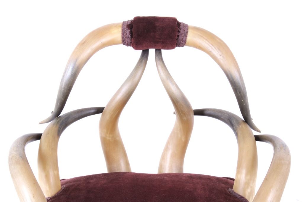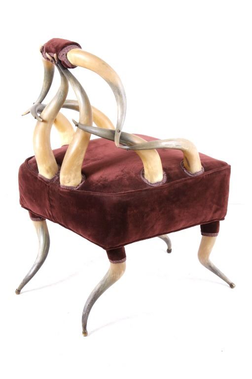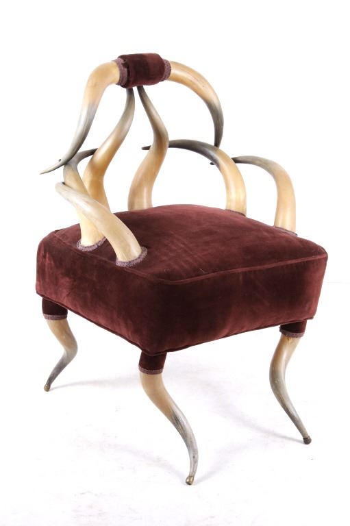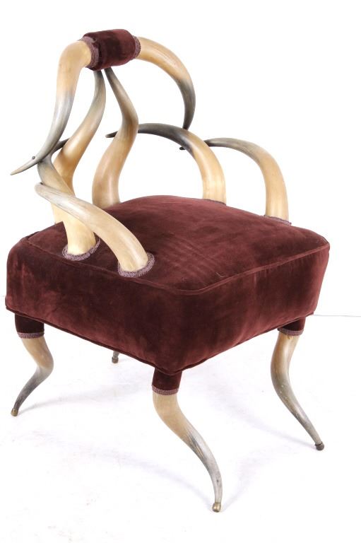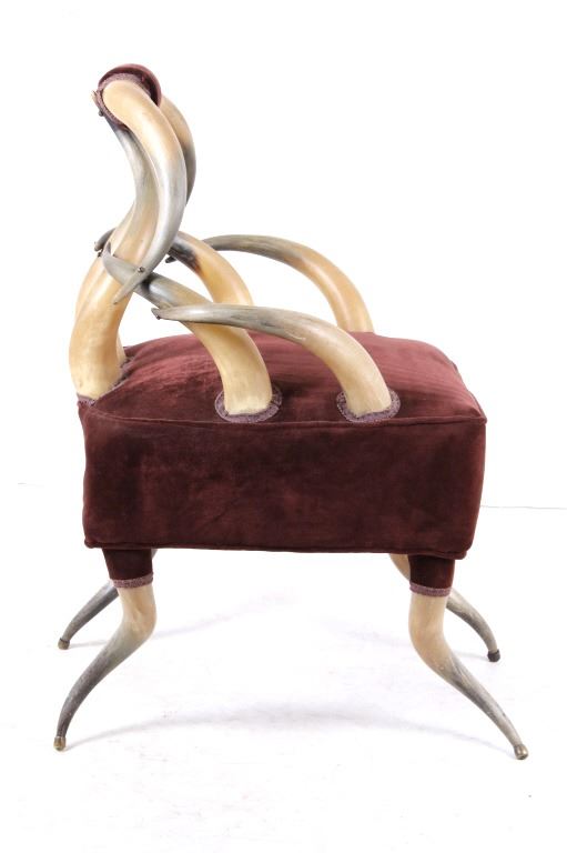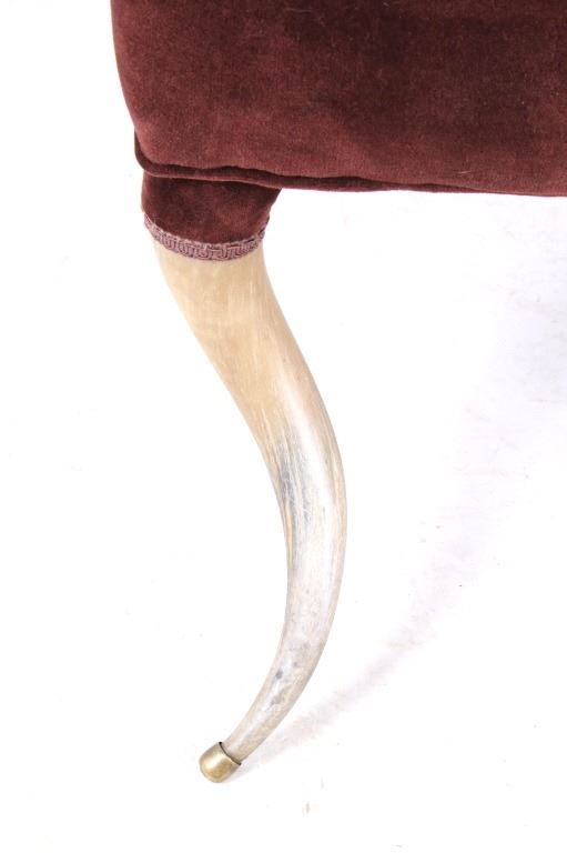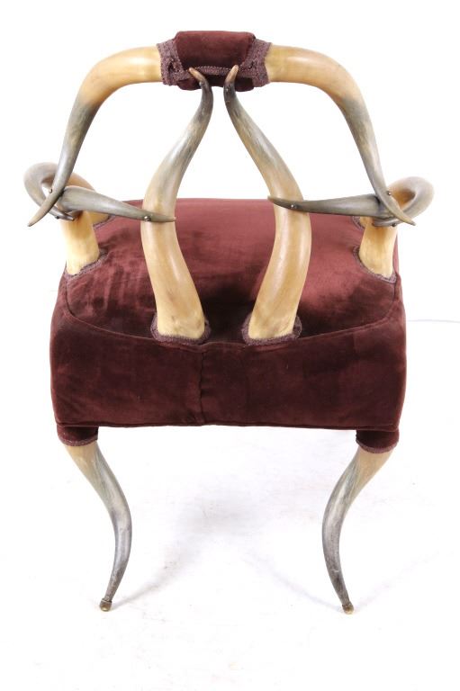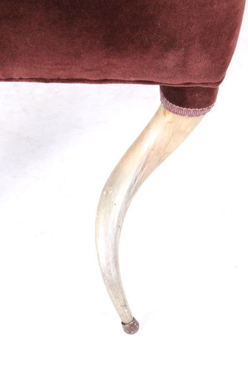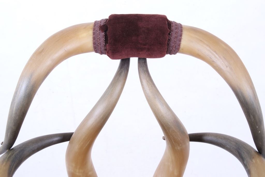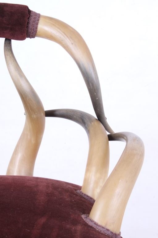 For your consideration is this Victorian steer horn & velvet chair. These steer horn chairs were very popular during the Victorian era. The Victorian era was the period of Queen Victoria's reign, from 20 June 1837 until her death on 22 January 1901. This beautiful example of these chairs includes an upholstery of majestic maroon velvet with steer horn back, chair arms and legs. The seat is in good condition as is the entirety of the chair with the steer horn feel adorned with brass caps. The measurements of this chair are 39" x 27 1/2" x 24".