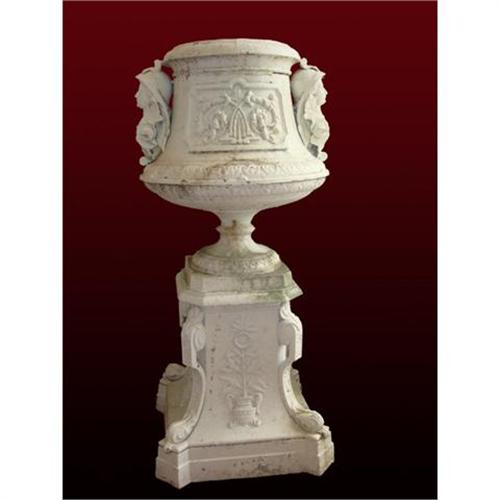Victorian Etruscan Revival cast iron urn. Turn of the century, classical design. White painted. Urn and base atttached as one piece. Romantic, with a touch of Baroque. Beautiful addition to any garden or solarium, or a focal point in a dining room, foyer or sitting room. Probably made for a grand estate or villa.