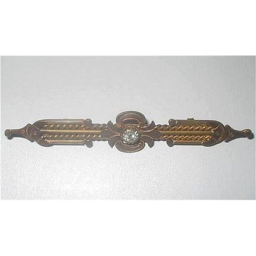 The Victorian's were very fond of designs from ancient history, which in turn encouraged many revivals of early jewelry. The height of the Etruscan Revival period was around the mid to late 1800's. This is a very lovely Victorian Etruscan rose gold bar pin with the centre having a twisted double bar of brass with the Etruscan rose gold detailing added as an additional layer at the centre, around a claw set clear paste stone of 5m, and at each end. Measures an extra long 3"x 1/2". Closure is a "C" hook. In excellent condition, with age tarnished patina intact. Circa 1880.