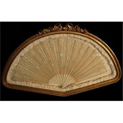 Victorian Fan in fan shaped Shadow Box. Frame is in good condition. The finish is antiqued gilt with red undertone. Roses, bow, scroll and bead design decorate the outer portion of the frame. The interior of the frame is lined with a cream colored watermarked (wavy dsign) satin. Frame size 30.5" wide x 18.25" ht x 2" deep, 5.6 lbs. Lace fan with intricate pattern is a cream color displaying handpainted blue flowers and green leaves. The handle is light colored. Condition: small tear in fan fabric with a few stitches missing.