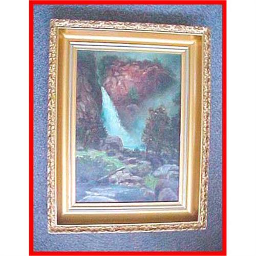 This original unsigned oil painting on canvas is a landscape of a rocky stream with a waterfall. The 20-1/4" by 14" painting is framed with a 26-3/4" by 20-1/2" by 3" thick gold wood frame. Is this mountain landscape a scene in Yosemite Park in California? Good condition with some scuffing and slight chipping on wood frame. Slight crazing on painting. No holes in canvas. No background on this Victorian Period painting.